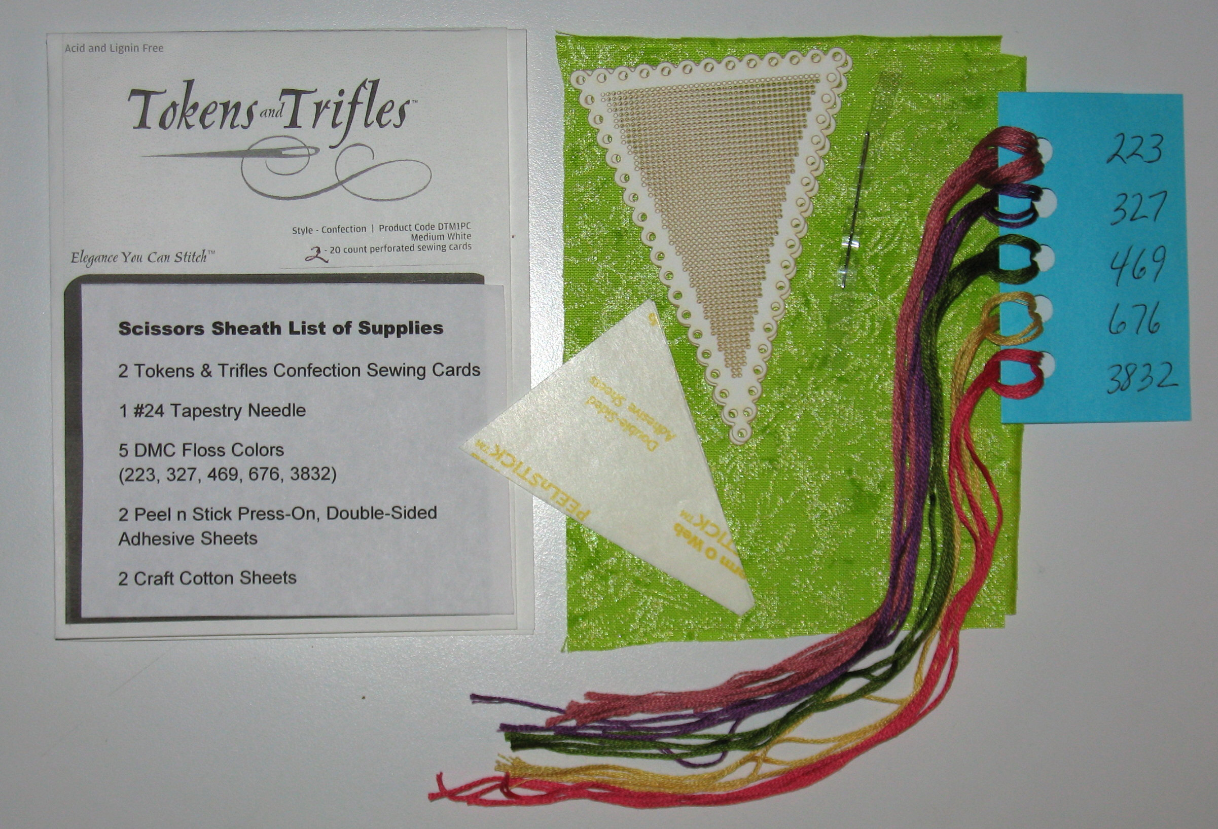 The scissors sheath is made on 20-count Confection Perforated Sewing Cards from Tokens and Trifles. However, they were out of stock until at least February. But rather than wait & find myself in a difficult position of having to scramble with little time, I started contacting retailers identified on the Tokens & Trifles website as being retailers. Well, I ended up contacting 3 stores still in operation who had a few packages in stock. So, I’d like to thank Lavinia from Counted Embroidery in Califon, NJ, Sue from The Log House in New Castle, PA, and Judy from Judy’s Stitchery Nook in Harlingen, TX all of whom were generous to give a discount on the packages. In addition, Sue sent along patterns for other ornaments in case our chapter members would be interested in doing any of them. So nice!! I also want to mention that Nordic Needle, who was selling back issues of the magazine, referred us to the publisher, Hoffman Media LLC, because we wanted 20 copies & we got a 40% discount when we told them we were an ANG Chapter!