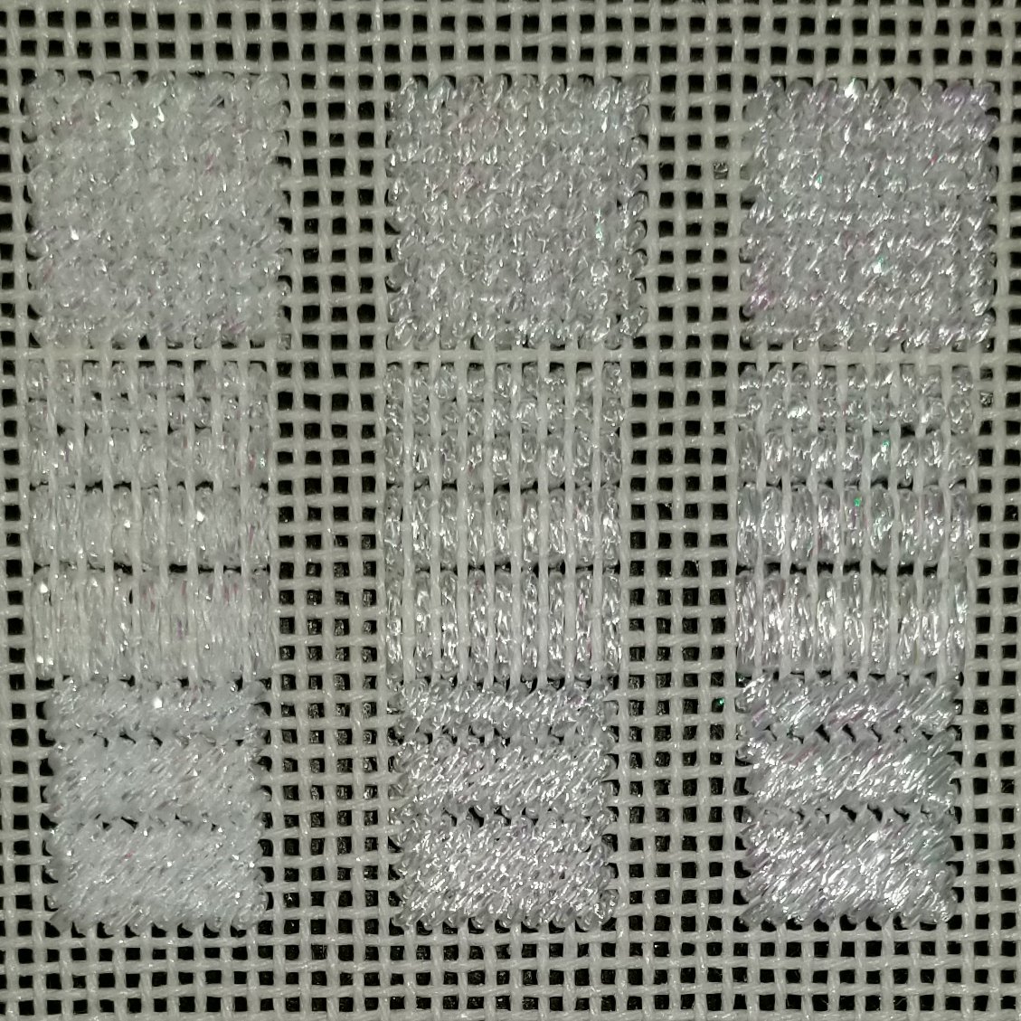These stitched samples are Snow (left), Alabaster (center), and Winter (right). All 3 threads are similar in size to a #5 perle cotton and worked well with good coverage on 18 count canvas.