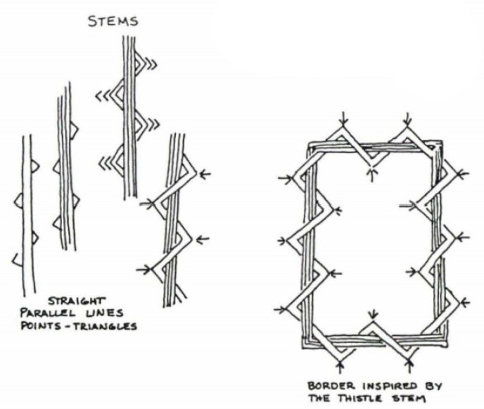 A series of articles, “From our Mind into a Design” were published in American Needlepoint Guild’s (ANG) Needle Pointers magazine by Debbie Deem in the 1980s. Debbie takes a thistle sketch and leads you through the process to develop a very creative interpretation of the sketch (not pictured here). I’d love to stitch it. Here is how a thistle stem became a border. Very ingenious.