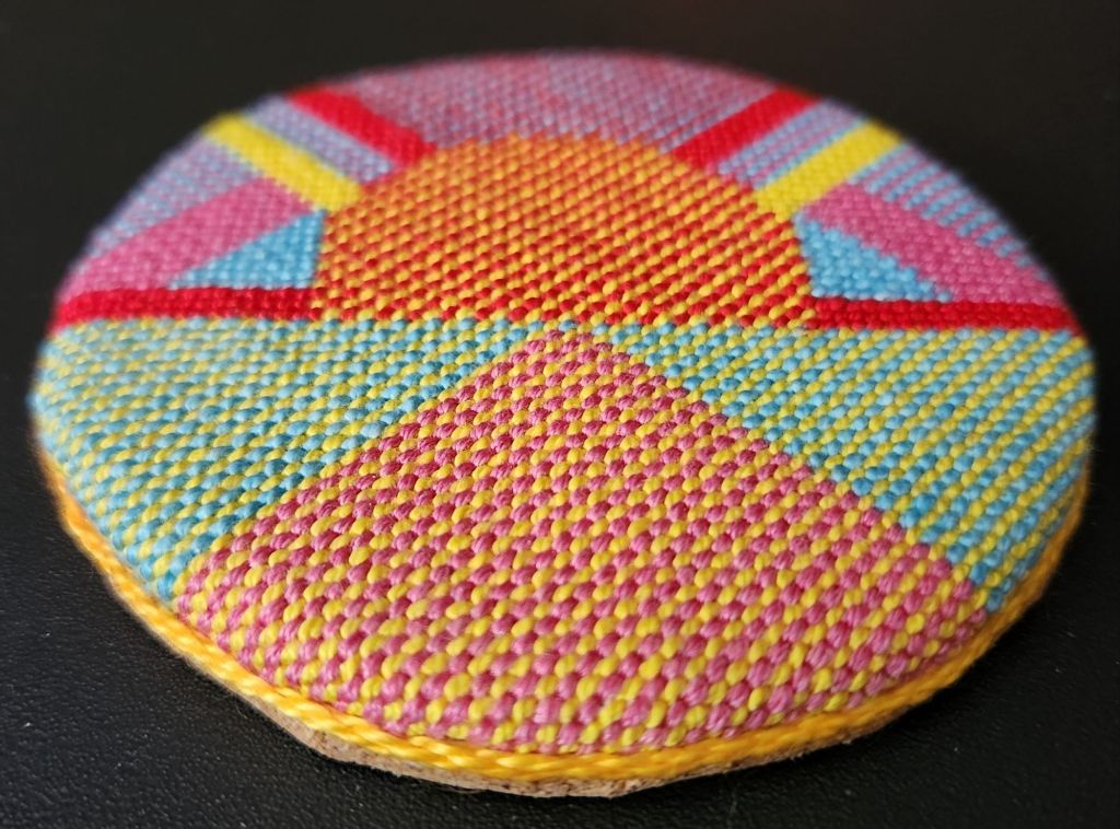 My experiment with optical color mixing or pointallism that was discussed previously in a post and in Needle Pointers (https://melitastitches4fun.com/2024/09/21/timeless-treasures-from-the-archives-covers-optical-color-mixing-and-more-in-september-october-issue-of-ang-needle-pointers-magazine/) has been finished into a coaster.