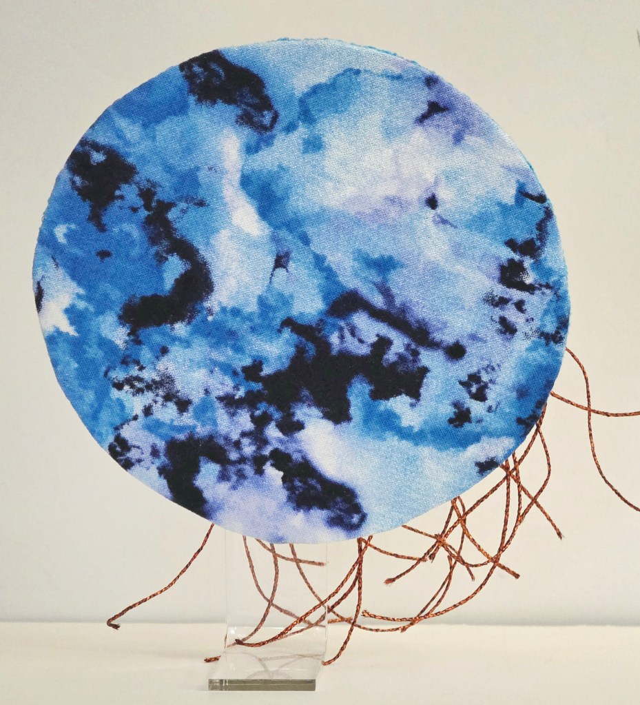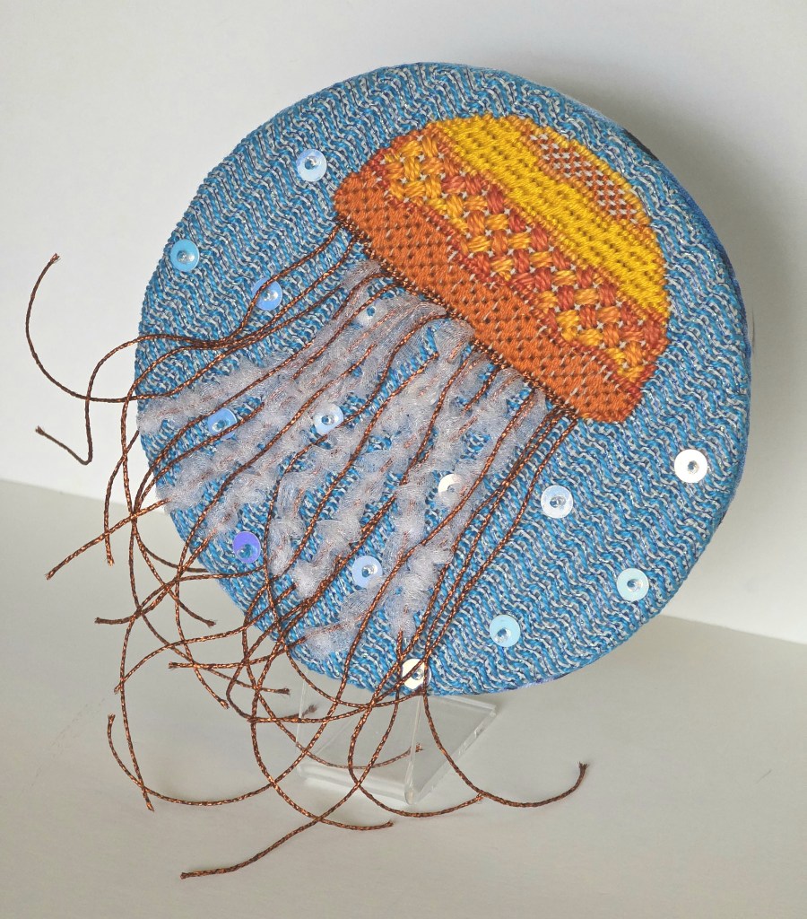 The Medusa Sea Jelly was designed by Kim from the Needle Artists by the Sea Chapter to support an exhibit, Shoreline Stitchers Showcase.