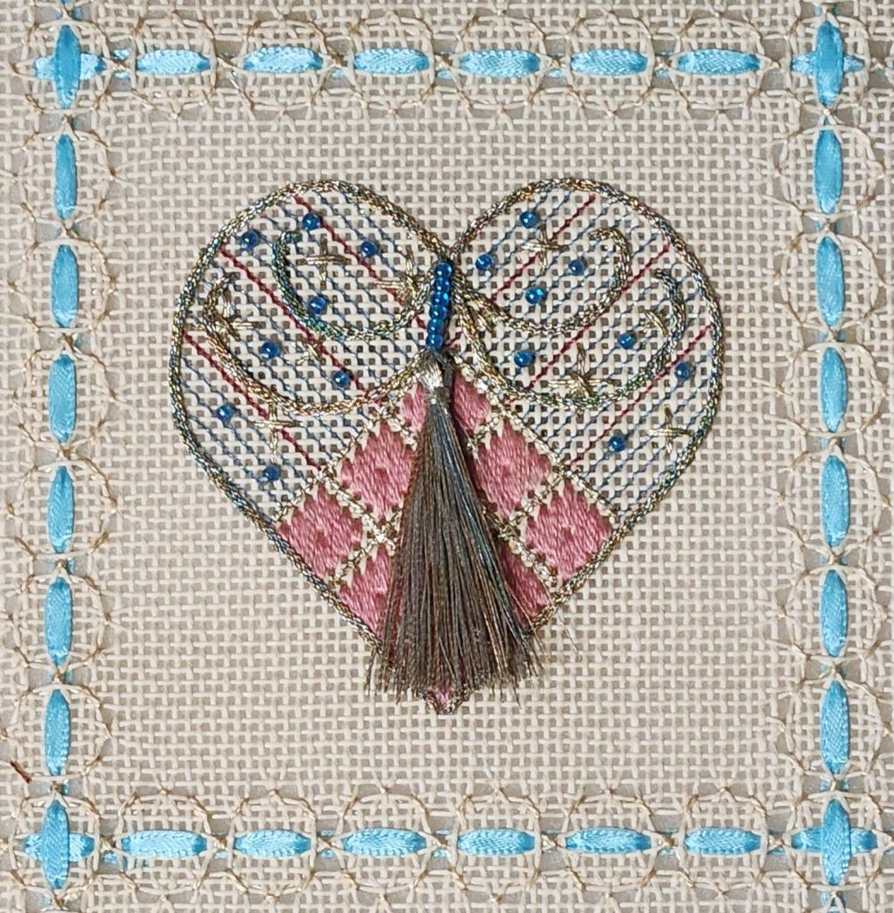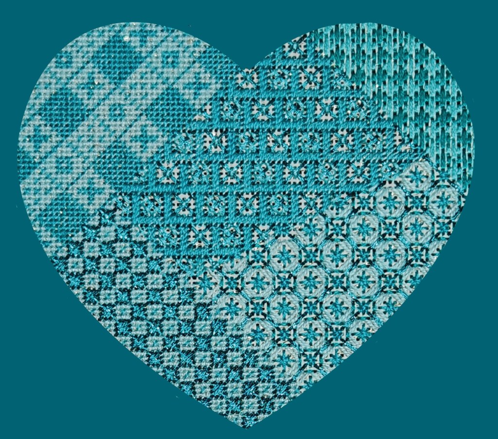 These are the heart ornaments that I contributed to the NJNA tree and shown unfinished in the September/October 2025 issue of Needle Pointers talking about hearts from past issues published originally in the early 2000s. They were designed by Michele Roberts. See also https://melitastitches4fun.com/2025/09/16/hearts-from-the-2000s-in-timeless-treasures-from-the-archives-in-the-september-october-2025-issue-of-needle-pointers-magazine/