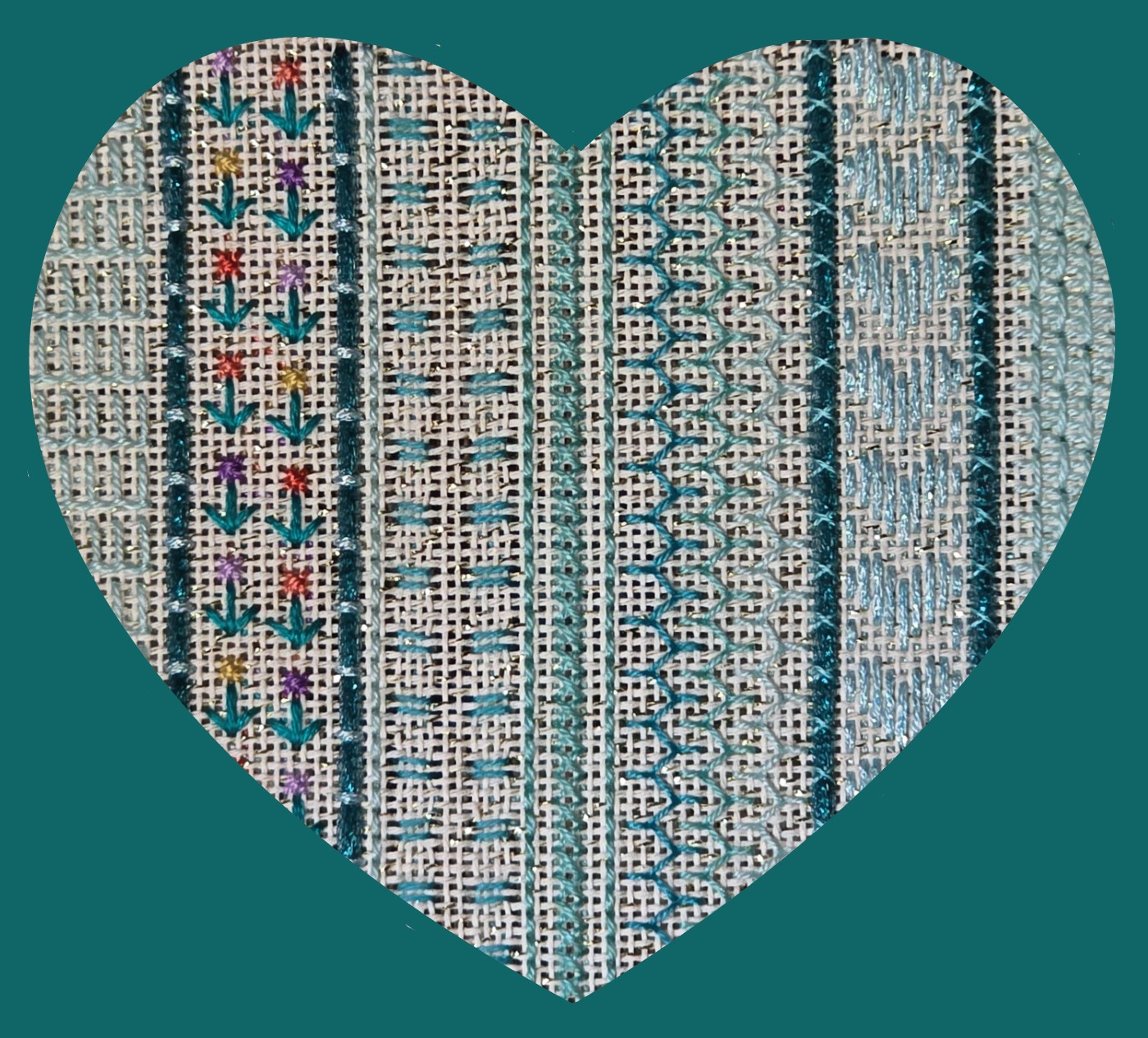 And, saving the best for last. Meghan from my ANG Main Line Stitchers Chapter stitched and created an excellent stitch guide for a Mindy canvas, Folk Heart. I did the diagrams, and her notes made writing up the stitch guide a breeze. For a relatively new stitcher (3-4 years?), she really excels. She did the finishing herself too. Her first attempt at that! Amazing!!