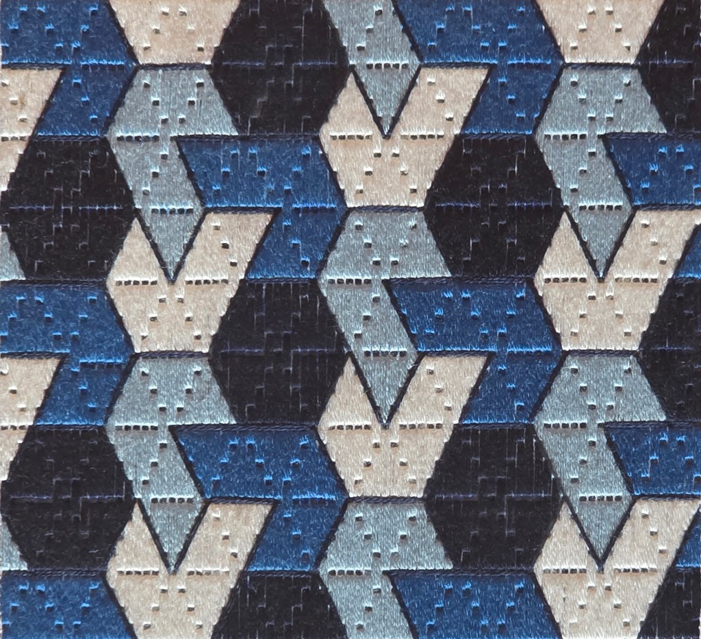I selected Persian Carpets Knots because of the 3D effect it creates and it was described as a “mysteriously interesting pattern”. It was a bit challenging especially the compensation. This grid helped keep me on track.