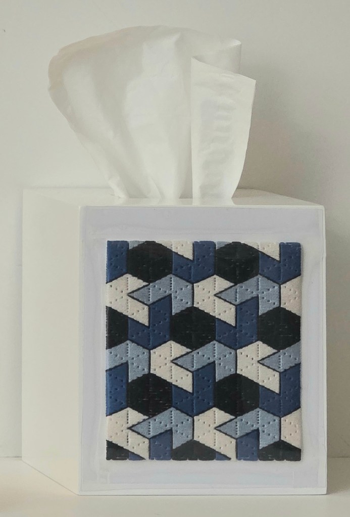And, placed onto a tissue box for the bathroom (with a vinyl cover held in place by double stitch tape).