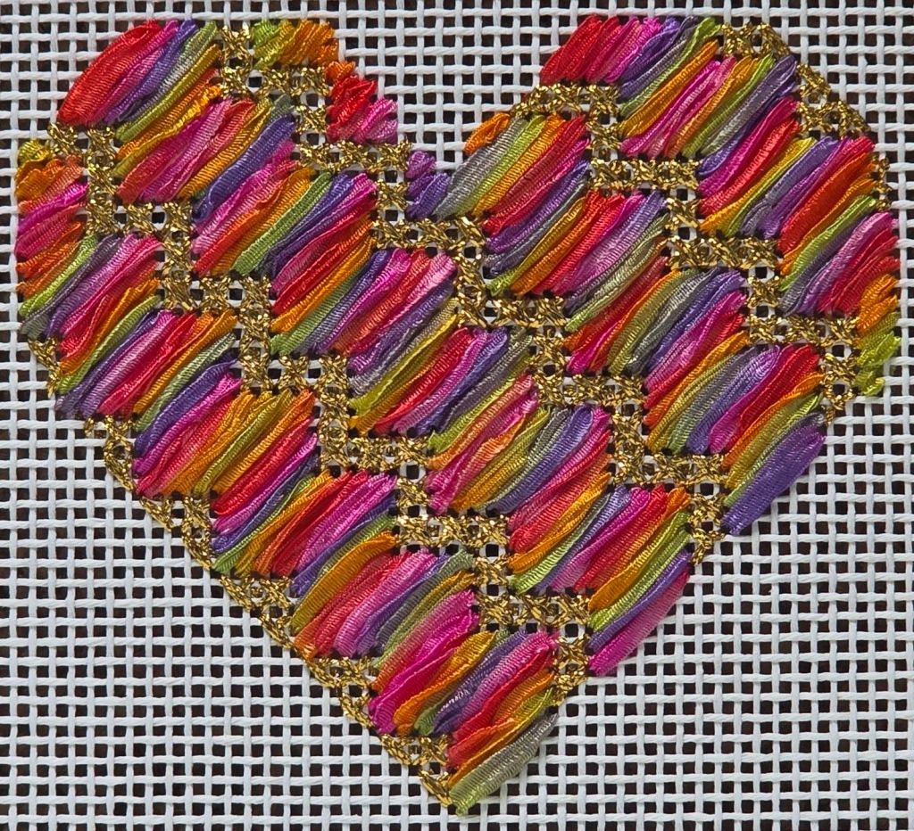 My favorite has to be the one by Michelle Roberts using ribbon. This is one of four colors that I did. It’s on 10 count and worked up quickly using Lion Brand Incredible Ribbon Yarn as suggested by Michele Roberts. I was so sorry to hear that she passed away recently. I couldn’t buy just one color, I had to buy three and must have enough ribbon to make about 40 more! But, that means more finishing has piled up on me! See the other hearts in the current issue of Needle Pointers. My paper copy just arrived!