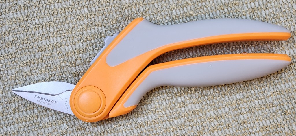 Cut up to edge in triangles (point into canvas) using short scissors, quilting nip scissors. I won’t mind adding another pair of scissors to my finishing bag. For an irregular shape, start at the indented areas.