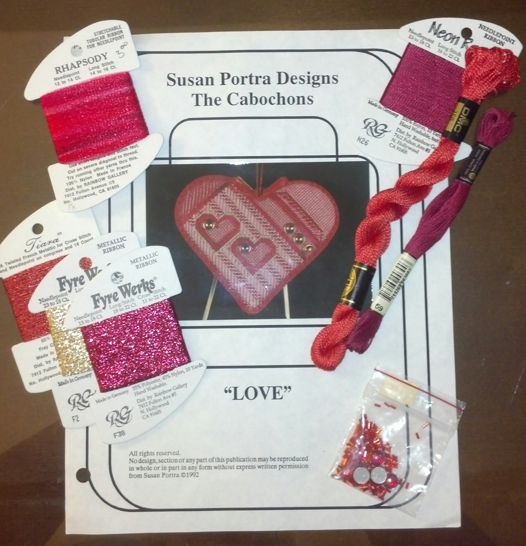 A Susan Portrait kit for a Cabachon Love heart ornament including threads and beads.