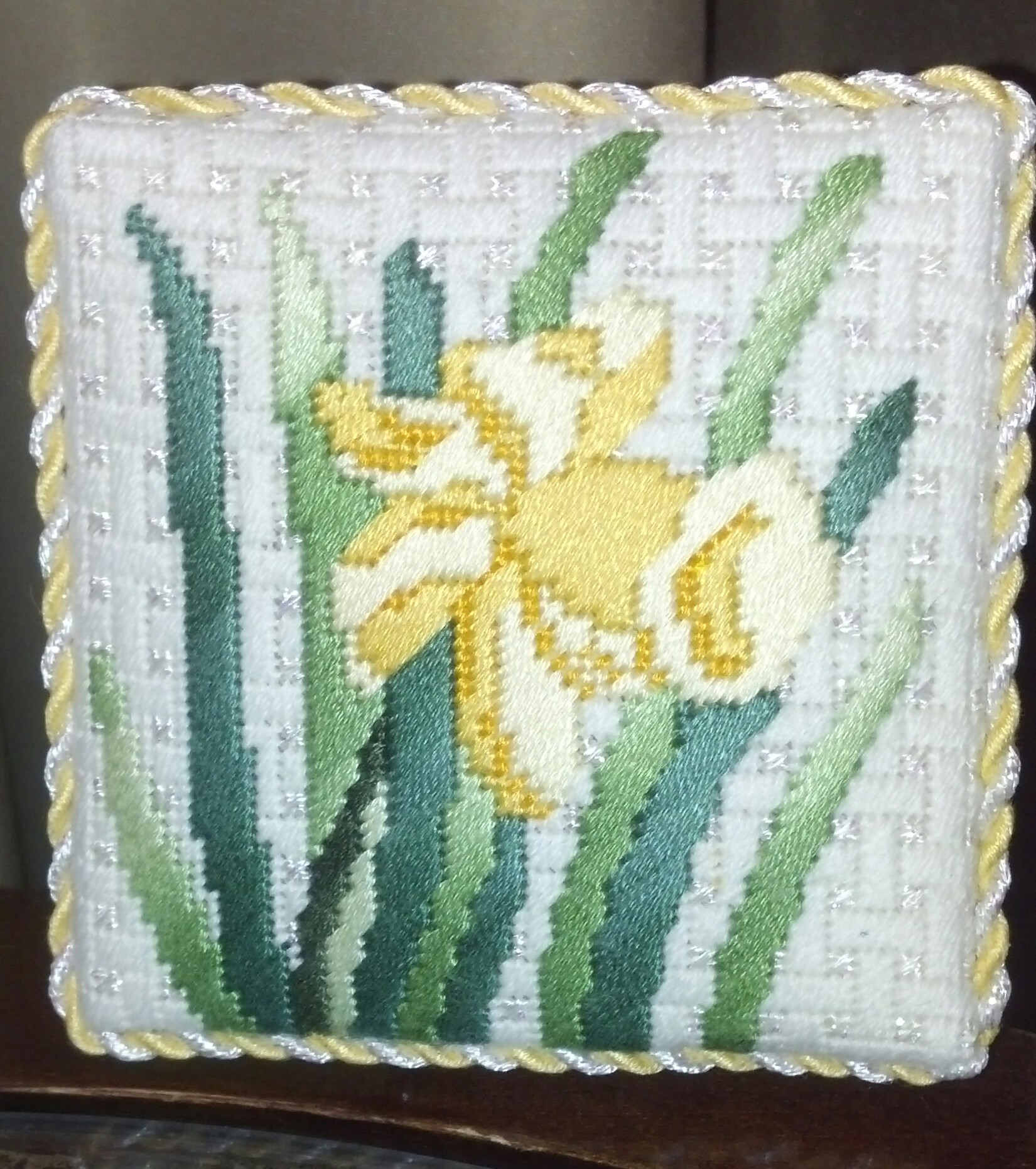 Lilly Stand Up stitched by Celia McC and finished by Karen R. This is built as a stand up piece (about 3″ sq) with a plastic base, very clever. And, it will join the other yellow stitched & non-stitched flowers in our bedroom.