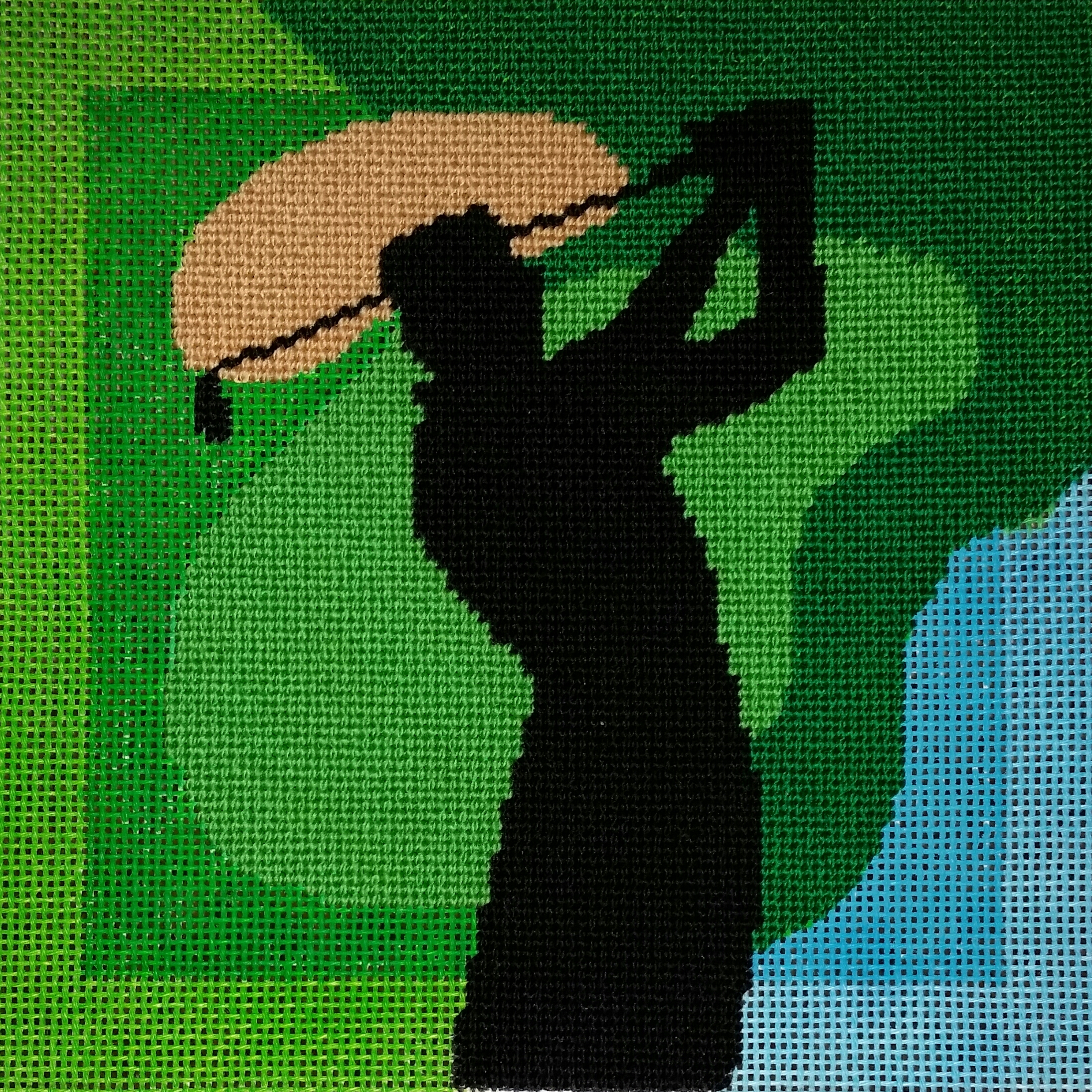 The interesting thing I noticed was that the thread wasn’t twisting (one of my usual problems with most threads). It wasn’t until I read Mary Corbet’s post about “The Needle You Need!” when I understood better about the benefits of the chenille needle that I’m using for my Gentle Waves piece. I had it out because that has such thick threads & just decided to use it for this piece because of the 14 count canvas. According to Mary, the larger eye has “more room for the thread to move around in there without getting mauled” and “Wool just works better with them. Try it!! You’ll be surprised how much easier it is to control wool thread, to keep it intact and less fuzzy, and to stitch with it in general.” I stumbled into it & now I know why the chenille needle is working so well for the golfer! I’ll have to select my needles more thoughtfully in the future.