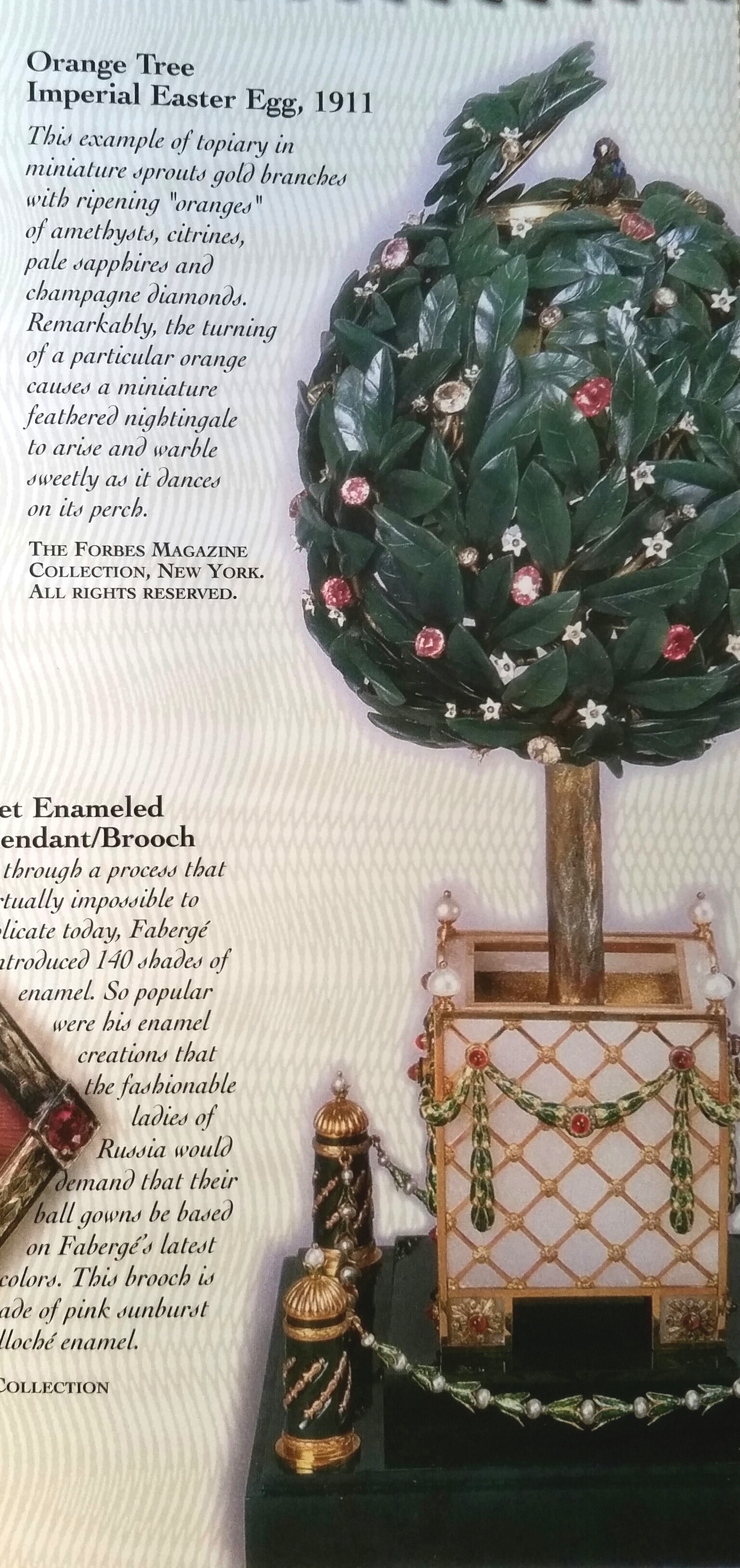 The Faux-Berge Orange Tree Egg was designed by Michele Roberts. I enjoyed meeting her during a great ANG Seminar class in Chicago (2014) & it was fun to stitch. I have been enjoying it again now for a couple of weeks – good timing to be here for the upcoming spring & Easter. I wanted to show it to my ANG chapters before posting here. And, I am glad I waited to post because I came across a photo showing the real egg in a brochure from 2001 when a Faberge exhibit came to Wilmington, DE.