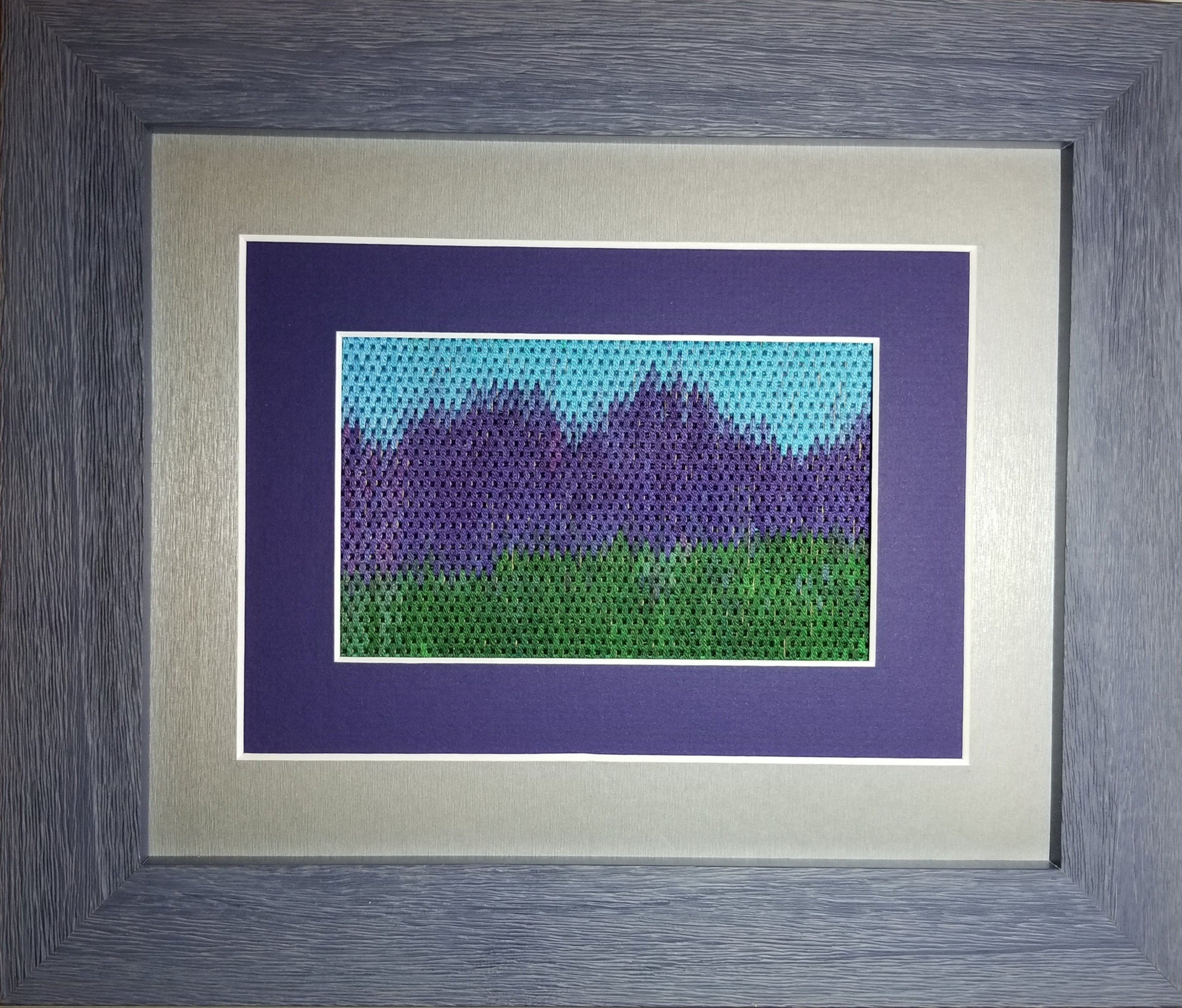 I wanted to explore using one overdyed thread with a few distinct colors to see how I could control the color of that overdyed thread in a single design that was pictorial in nature. This thread popped out at me because it had blue and green. I knew using an overdyed blue thread for sky and an overdyed green thread for grass is very effective. When I saw that the color shift was green to purple to blue, I heard “America The Beautiful” singing the lyrics “purple mountains majesties” and knew this would be great for the exhibit in Washington, DC. I thought I’d control the color best with the brick stitch. However, the various lengths of each color varied within the skein make controlling the color more difficult. There is some broken color placement which when viewed from a distance mixes optically to form the impression of reflected color. And, I obtained some aerial perspective with some of the mountains in the far distance which blurred into a bluish-purple haze.