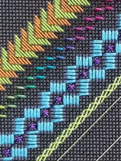 Bargello is always fun to stitch. I purposefully selected a portion of the overdyed Gloriana that went from green on the outside corner in to the pink to pull in the same colors used in the upper left area. This is probably the first time I laid 2 strands of Kreinik rather than using a heavier weight Kreinik. It tended to tangle easily.