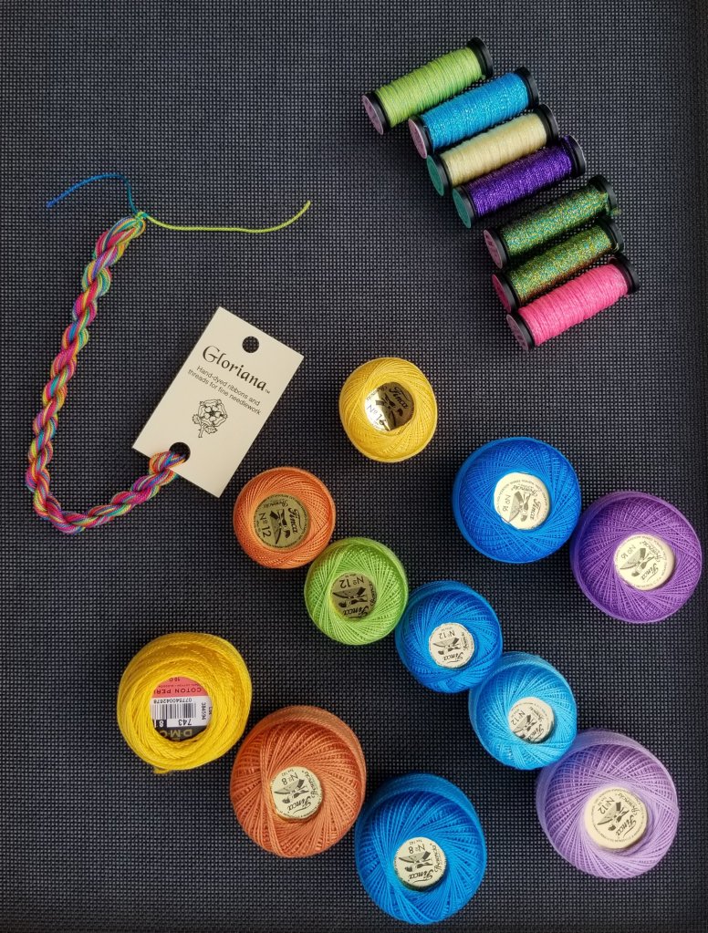 The kit for Interchange arrived and class starts Monday. More threads!! The balls of threads except for one from DMC are all Finca by Presencia (#8, 12, and 16). I will ask Linda why she selected more Presencia over DMC but I haven’t tried them before and it is always good to try a new thread. And, such pretty colors that are just so bright and bold. Fun! By working on the black 18 count canvas, the colors will really pop.