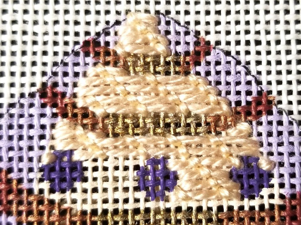 A couple of nights before NJ Needle Fest, I sent out a request to locate a dark purple in DMC Perle #8 or #12. Two members of my other chapter, the NJ Needle Artists, had 3 possible choices & the one from Rosie hit the mark, a # 8 Finca 2720. I added the 6 purple round areas then using a double layered cross with a small cross on top. It was nice to see everyone after missing the 2019 Fest (because of a cruise I took) and the 2020 Fest was canceled due to coronavirus. I signed up for their 2022 NJ Needle Fest and it’ll be back in May.