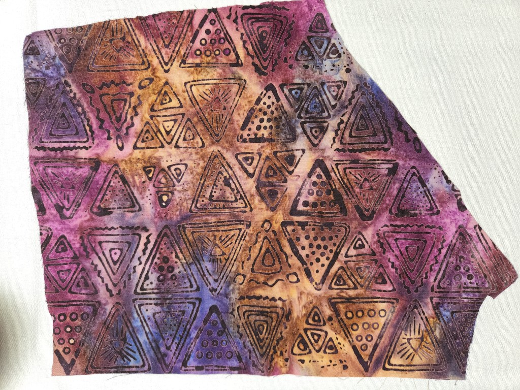 I selected a darker triangular piece because the background is going to be light. We learned how we would attach the batik fabric applique (it is being “previewed” in the photo – it is not attached yet). The applique looks big but is the same size as hers. I didn’t get much stitching done in the afternoon but that’s OK.