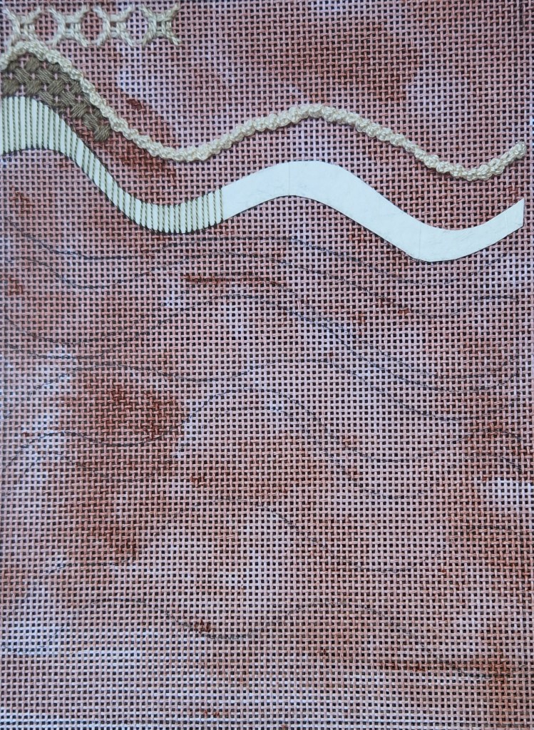 The stem stitch went in underneath just fine. However, once I got past the third row of Oriental stitch, it got tough because the area got so thin. But, I figured it out on graph paper. I didn’t fill in any of the Gobelin stitches yet.