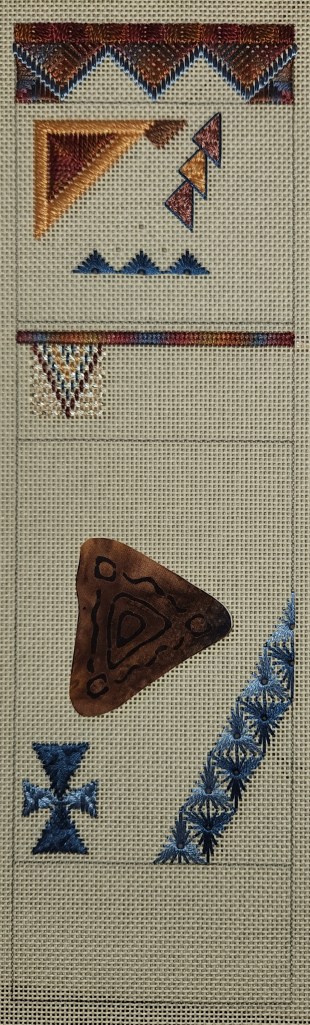 In the next section below on the right, the nine triangles match as they progress downwards as does the very slightly overdyed tent stitches. I stitched each side down with matching colored threads instead of stitching side to side. I did the same thing for the other nine triangles that appear horizontally further down.