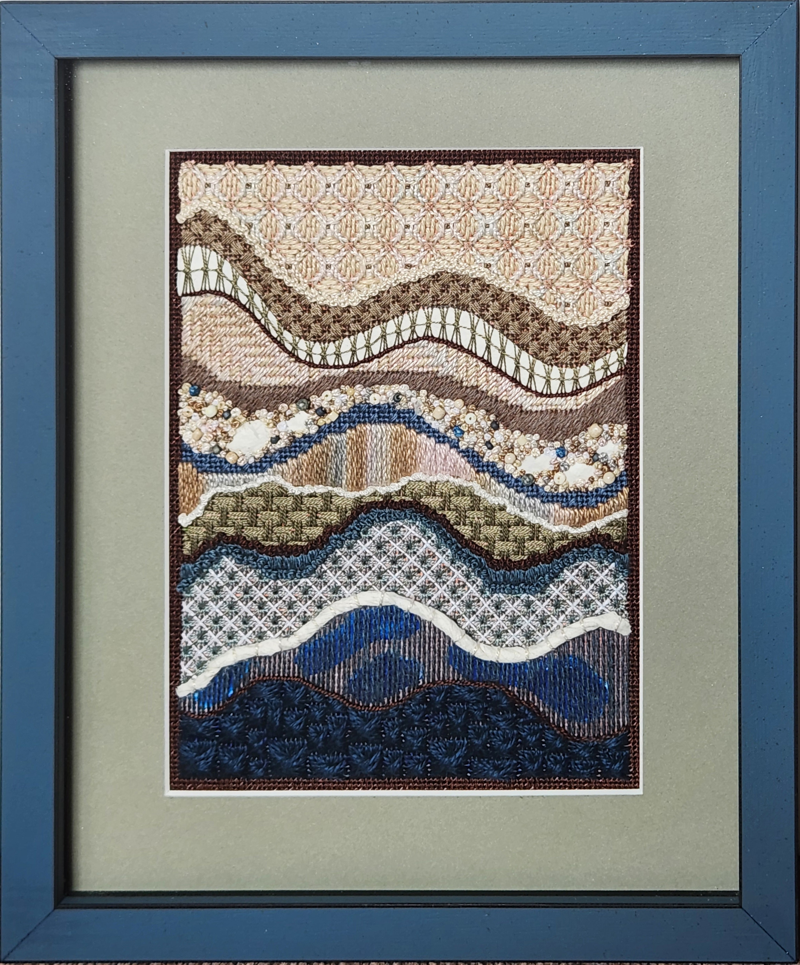 I finally took Blue Hills to get framed. You may recall from a previous post this was from an excellent class with Dawn Donnelly at the ANG 2022 Seminar. It is a “mixed media” piece that incorporates Dawn’s hand-made paper. It’s about 6″ x 8″ on 14 count. It was fun to stitch.