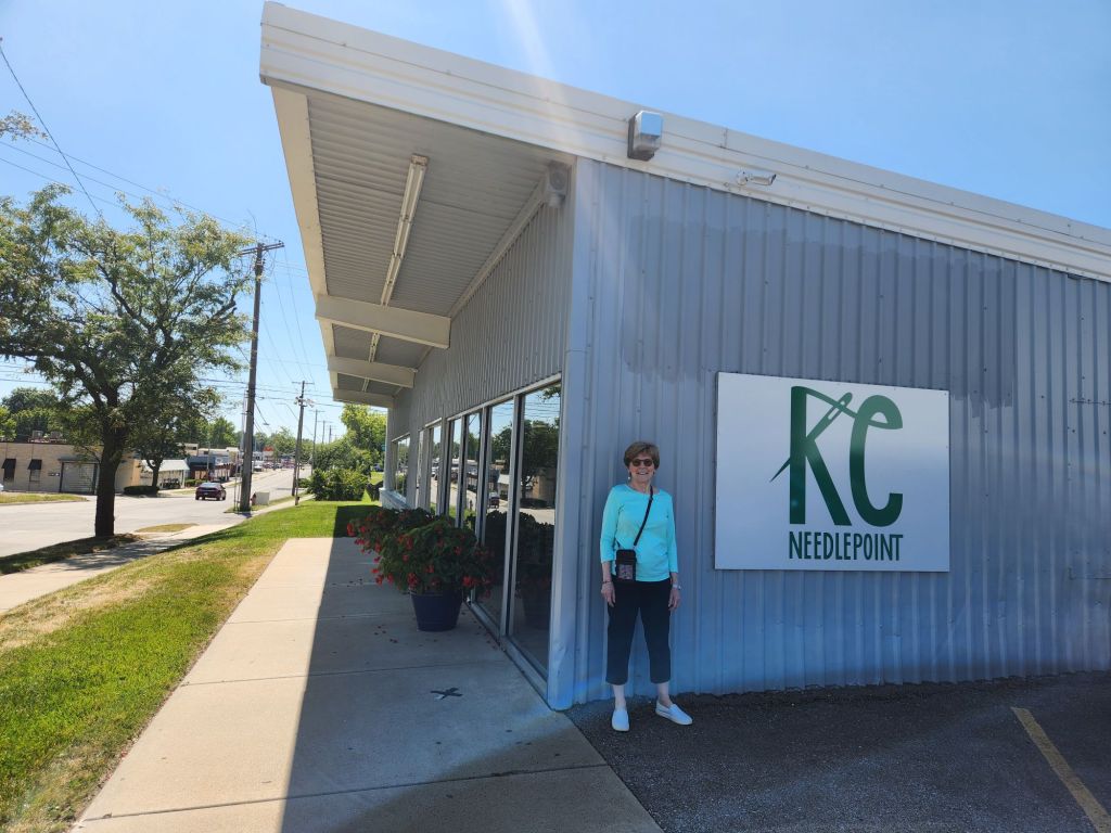 Linda M and I Ubered out to KC Needlepoint after lunch. It’s a huge store, good light, all painted canvases, and nice self finishing products. No counted designs. There’s Linda before we head inside.