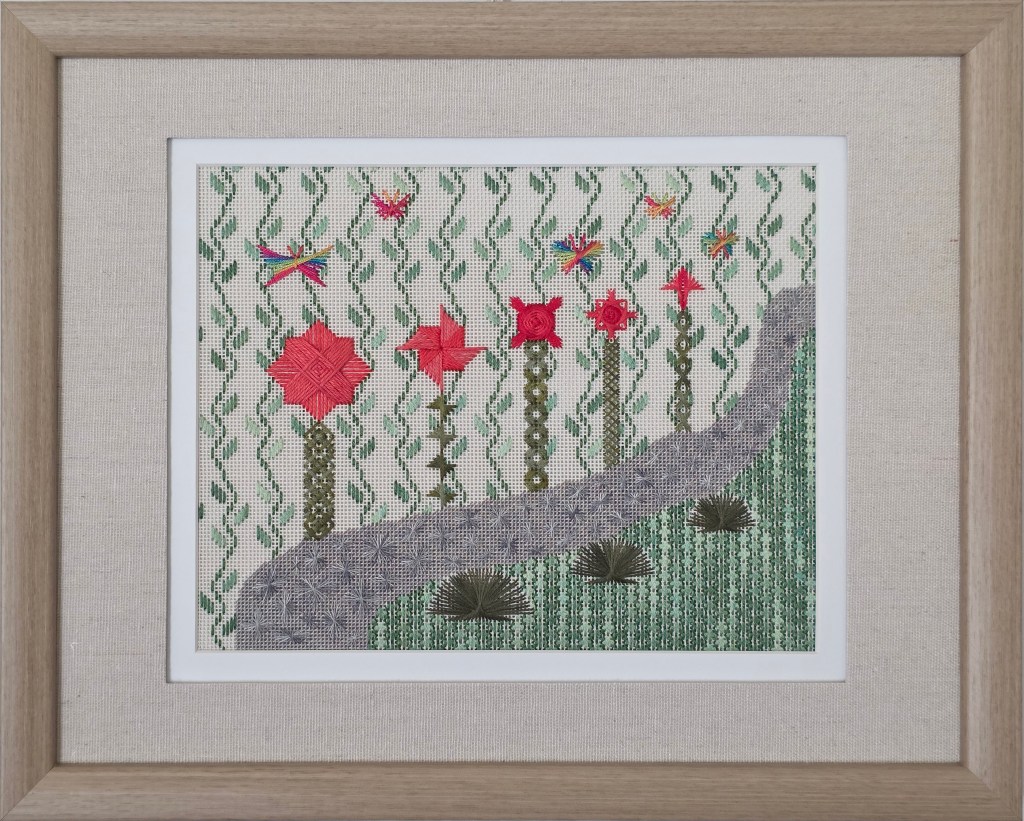 - “The bright pink (I call them coral) stylized flowers are fun! Your stitching shows your mastery of those specialty stitches.”