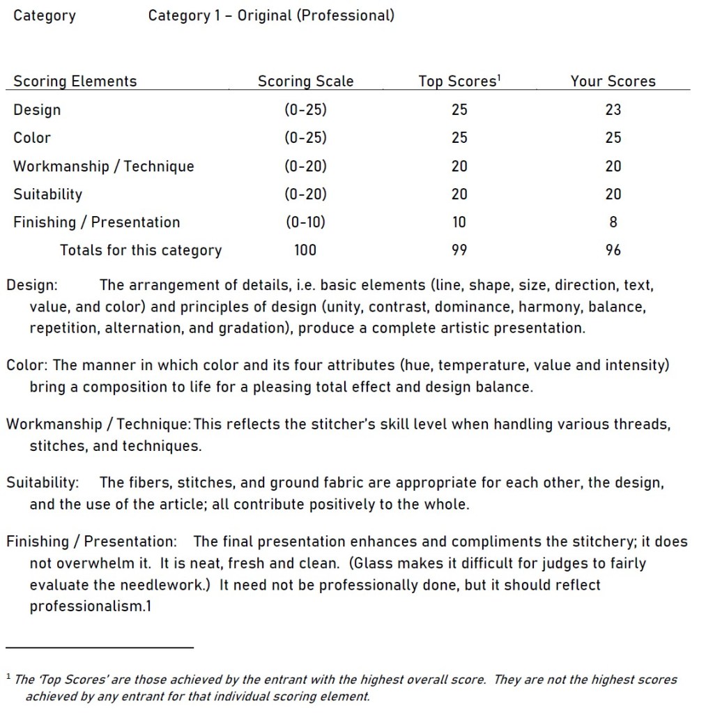 Everyone who exhibits gets the Judge’s Score sheet although the points vary by category (this is for original design). A summary of the critique which follows does cost $25 but is worth it to hear their thoughts about the piece. Always thoughtful, supportive, and offers constructive feedback.