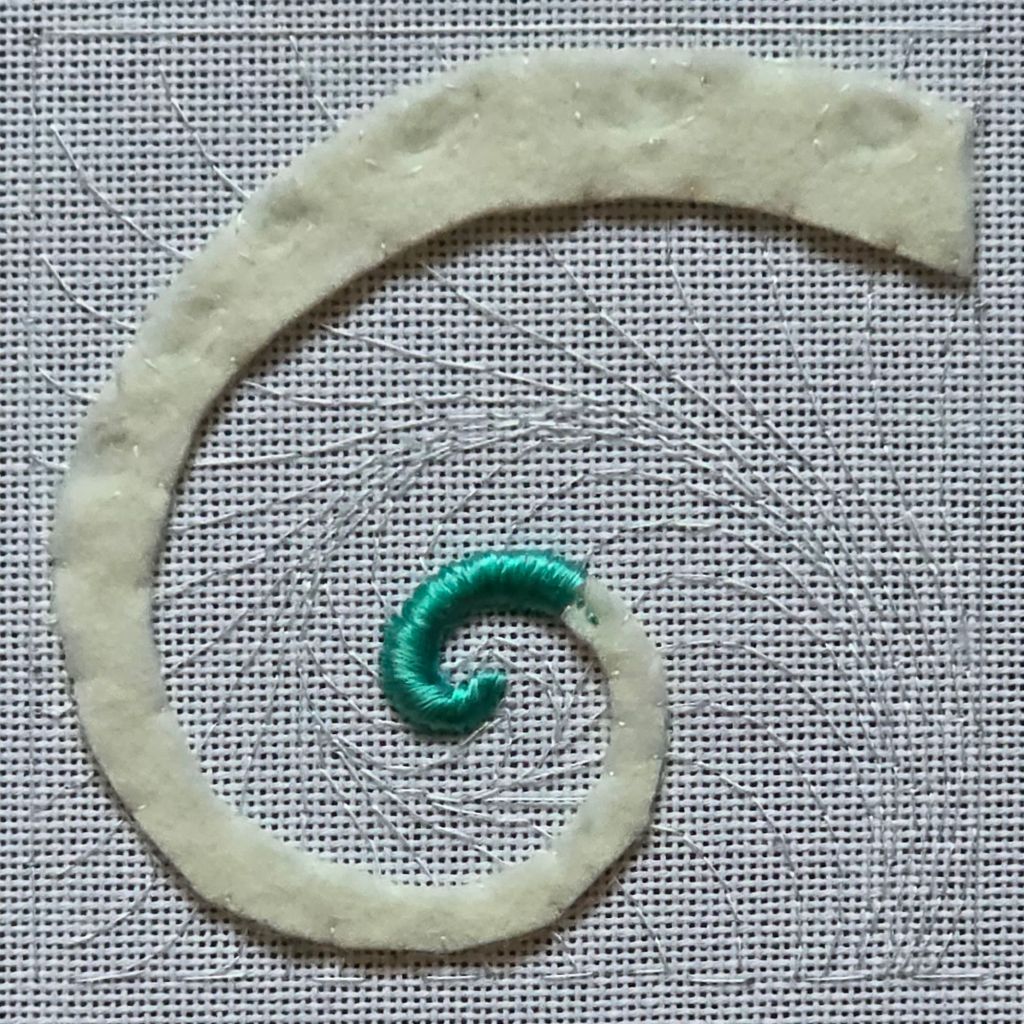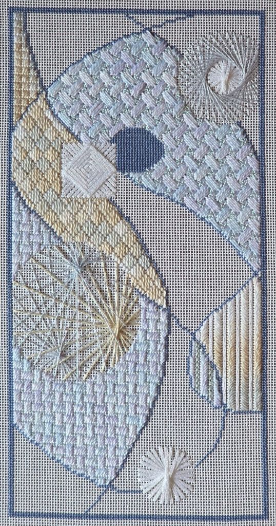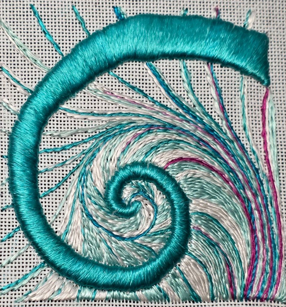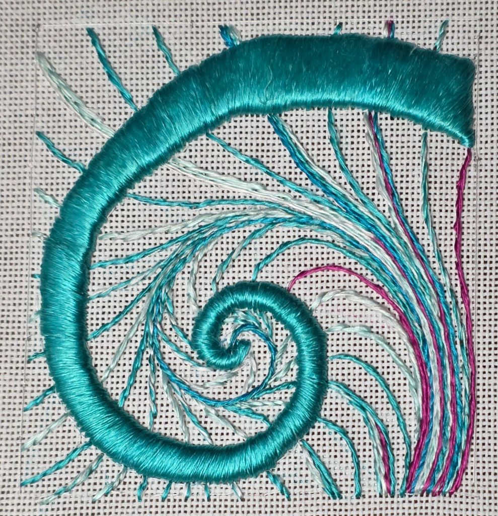 Besides working on my National Academy of Needlearts (NAN) which I won’t show until after the exhibit in March 2026, I will alternate stitching between three ANG Seminar projects. First up is Nautilus with Kay Stanis.
