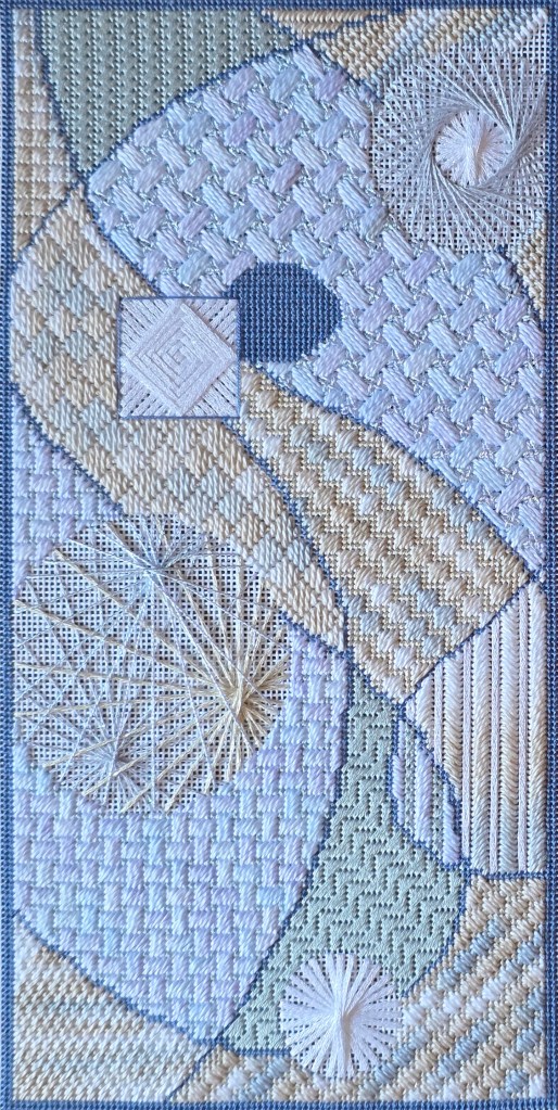 Nights in White Satin by Jennifer Riefenberg was fun to stitch although several areas had some tricky compensation to work out. The soft pale blues with neutral colors is very calming. That completes Goal 21.