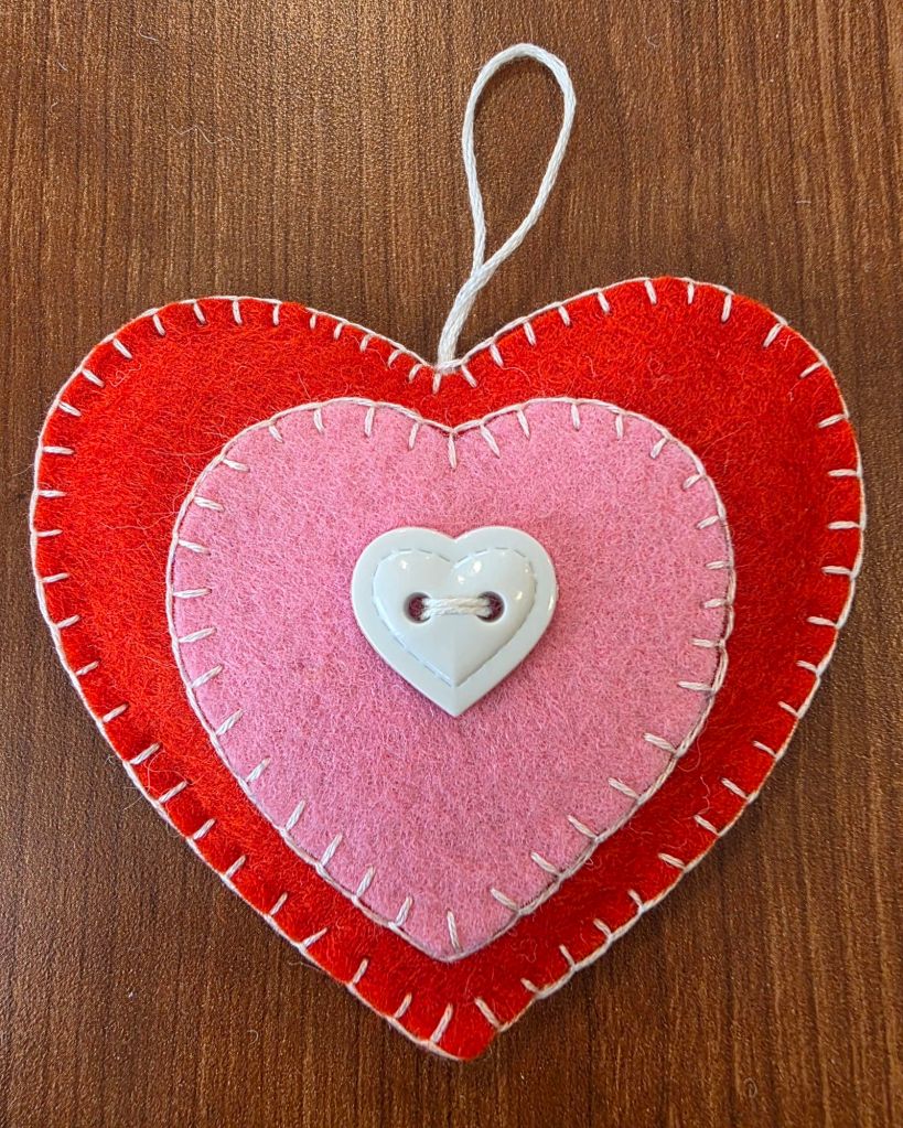 Sue S and Kathy A got us primed for next month’s penny rug project by having us work on these hearts. The materials supplied were precut felt heart shapes, floss, batting, and a button. The buttonhole stitch allowed most of us to finish prior to lunch. I attached the loop to the batting before closing the two sides.
