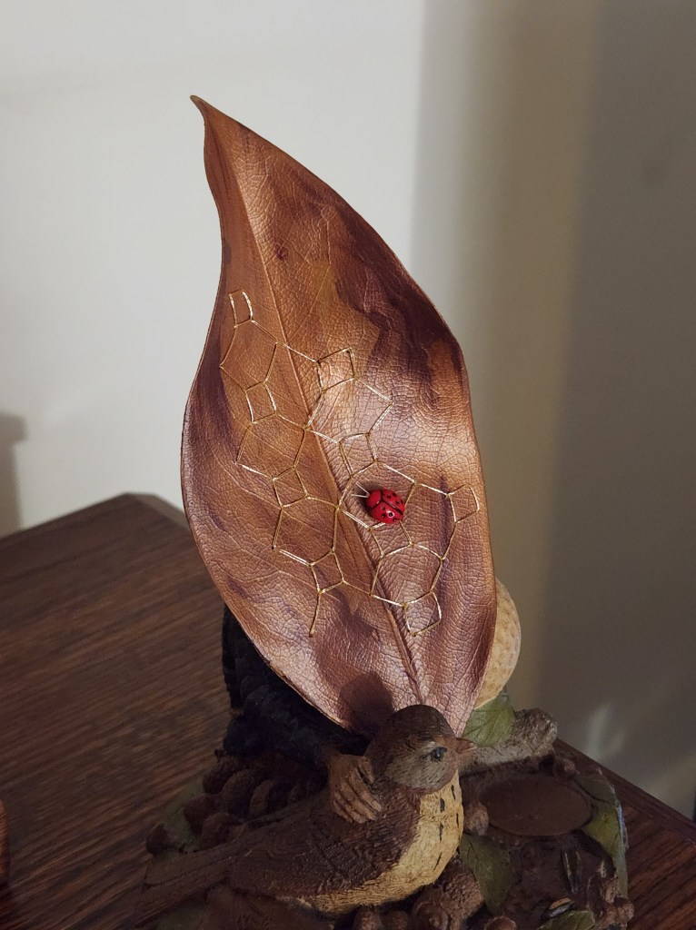It does make me happy to finish this. I glued (E6000) wooden dowels onto the back of each leaf and placed them in a vase for fall decor.