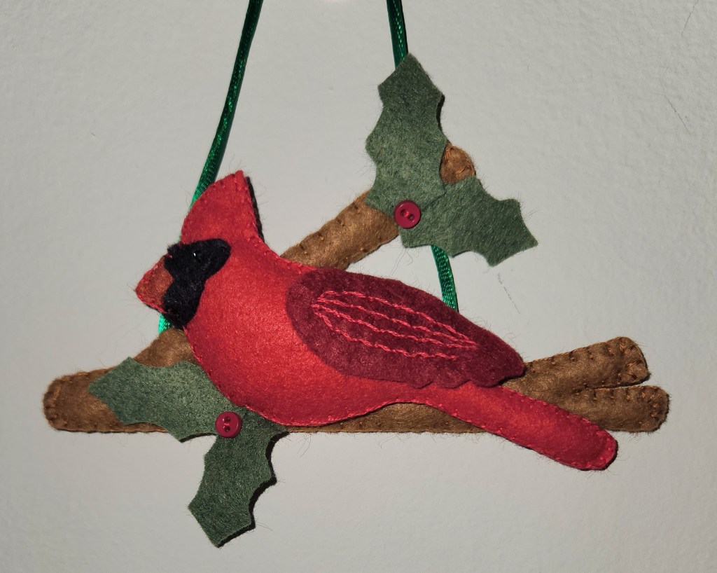Sunday basketball allowed me to complete the ornament. I found a perfect bead for the eye. I couldn’t see the French knot that was on the demo bird because it was black on black. But, the bead has just a tad of light reflecting off it to be seen. It really wasn’t a difficult project. Needlepoint pieces take so long that doing something with more immediate gratification was fun. And, the 3D effect is much more apparent on this than on needlepoint. I won’t seek felt projects out, but it’s always fun to try something new.