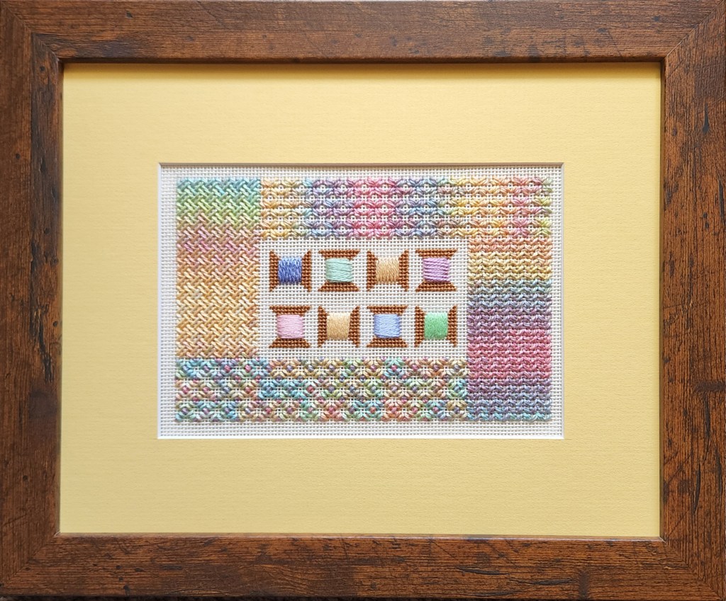 It seems to be more popular with EGA than ANG, and I’ve seen several exhibited at Woodlawn (one of which was Patti’s with spools as seen in this 2022 post: https://melitastitches4fun.com/2022/03/31/woodlawn-needlework-exhibit-2022/). In this one, the spools have been replaced by a name tag and even made into a picture frame. Karen is going to attach it to a small project bag. I love it. Patti’s stitched another great one and Karen said I could post this!