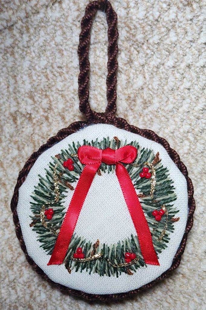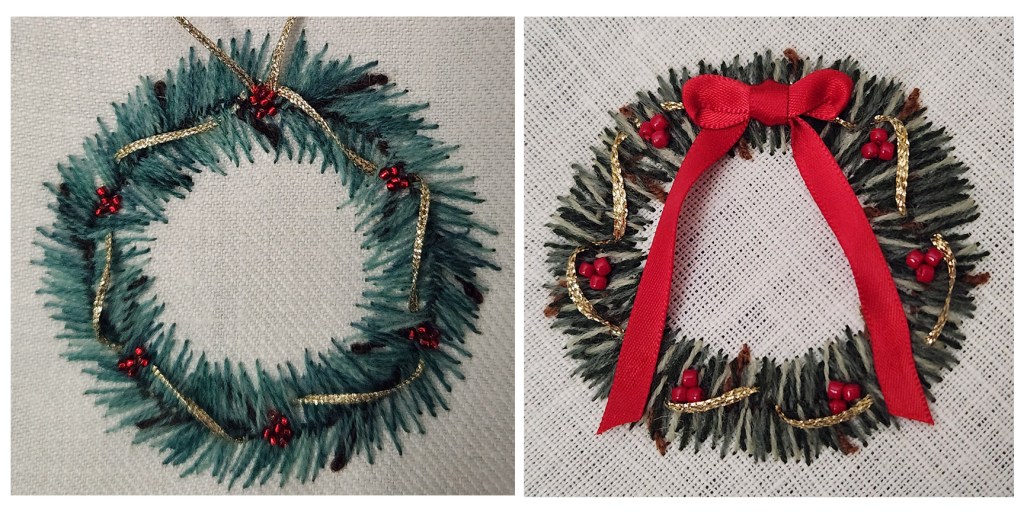 Crewel Wreath 1 was posted previously at https://melitastitches4fun.com/2023/12/03/post-dec-6-crewel-wreath-by-lucy-edmison-from-egas-website-for-the-brandywine-chapter/