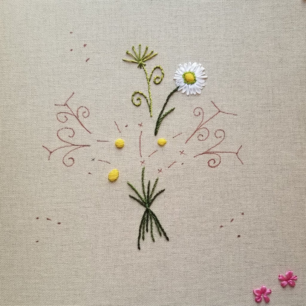 Given a little quiet time and my comfy stitching chair, I was able to finish the wild greenery (pistol stitch and wrapped backstitch), stems, the 3 remaining daisies, the 5 Periwinkle flowers, and the leaves. I left my 2 practice ones in the bottom right corner to show the difference.