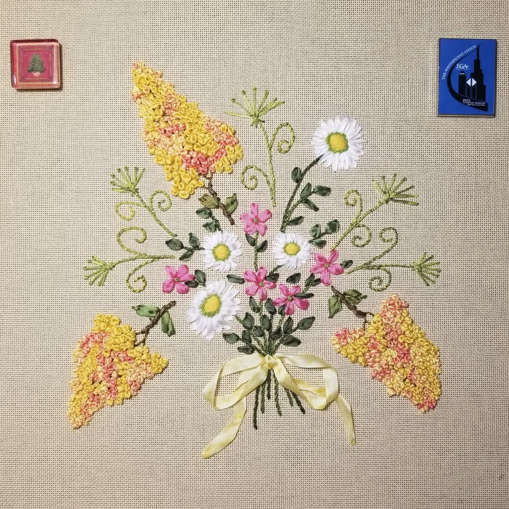 The lilacs were the most fun flowers of Annette’s Bouquet (EGA Seminar class from Deborah Mitek) perhaps because they are French and Colonial Knots which I am more comfortable with than the other ribbon techniques.
