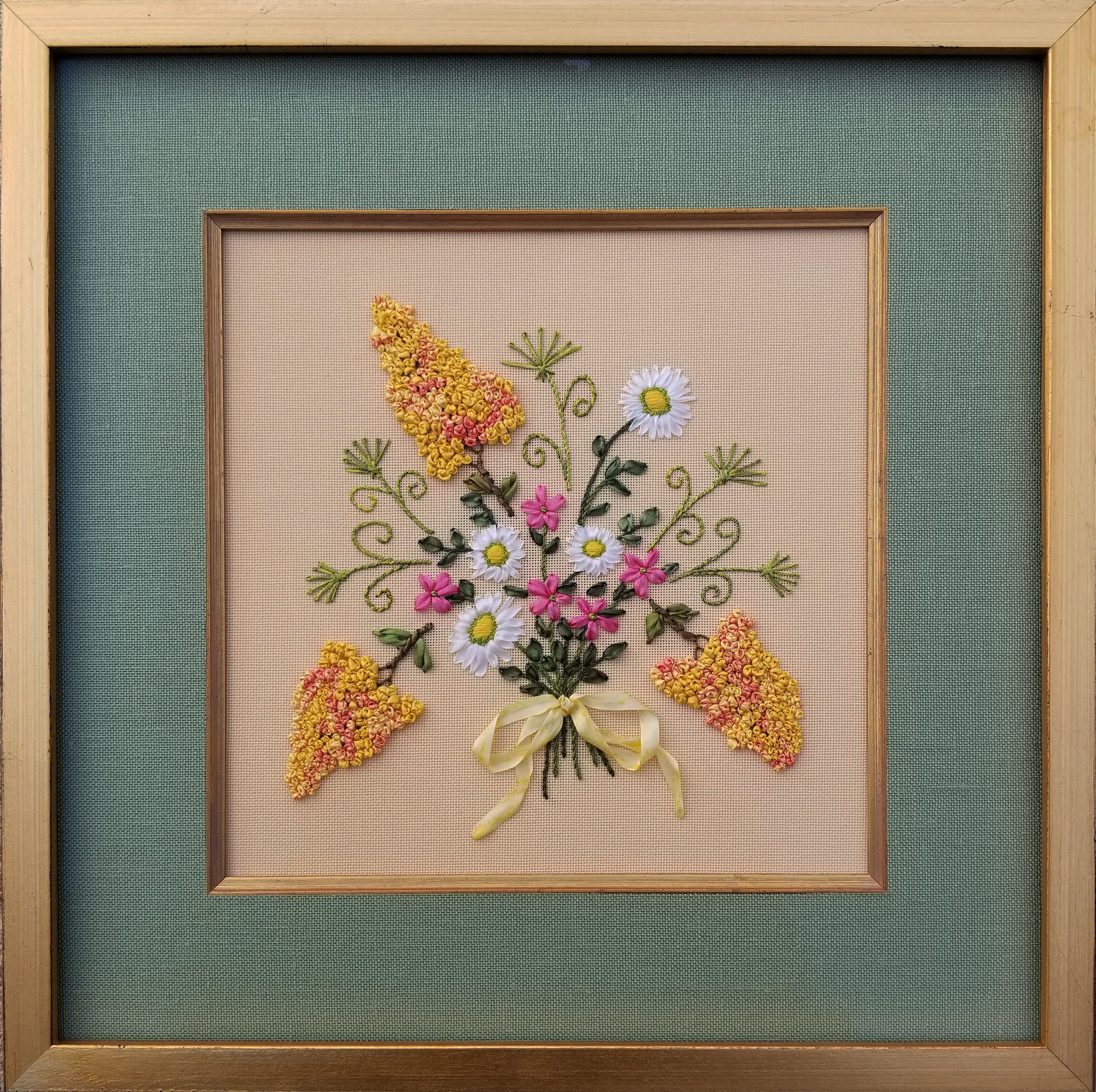 Annette’s Bouquet with Deborah Mitek was one of the classes I took at the 2021 EGA Seminar and has been framed since November 2021 but I forgot to post it here. A fillet allowed enough space so that the French Knots, Colonial Knots, and the bow would not get crushed by the glass (museum glass). Romeo’s did the framing but they are closed now.