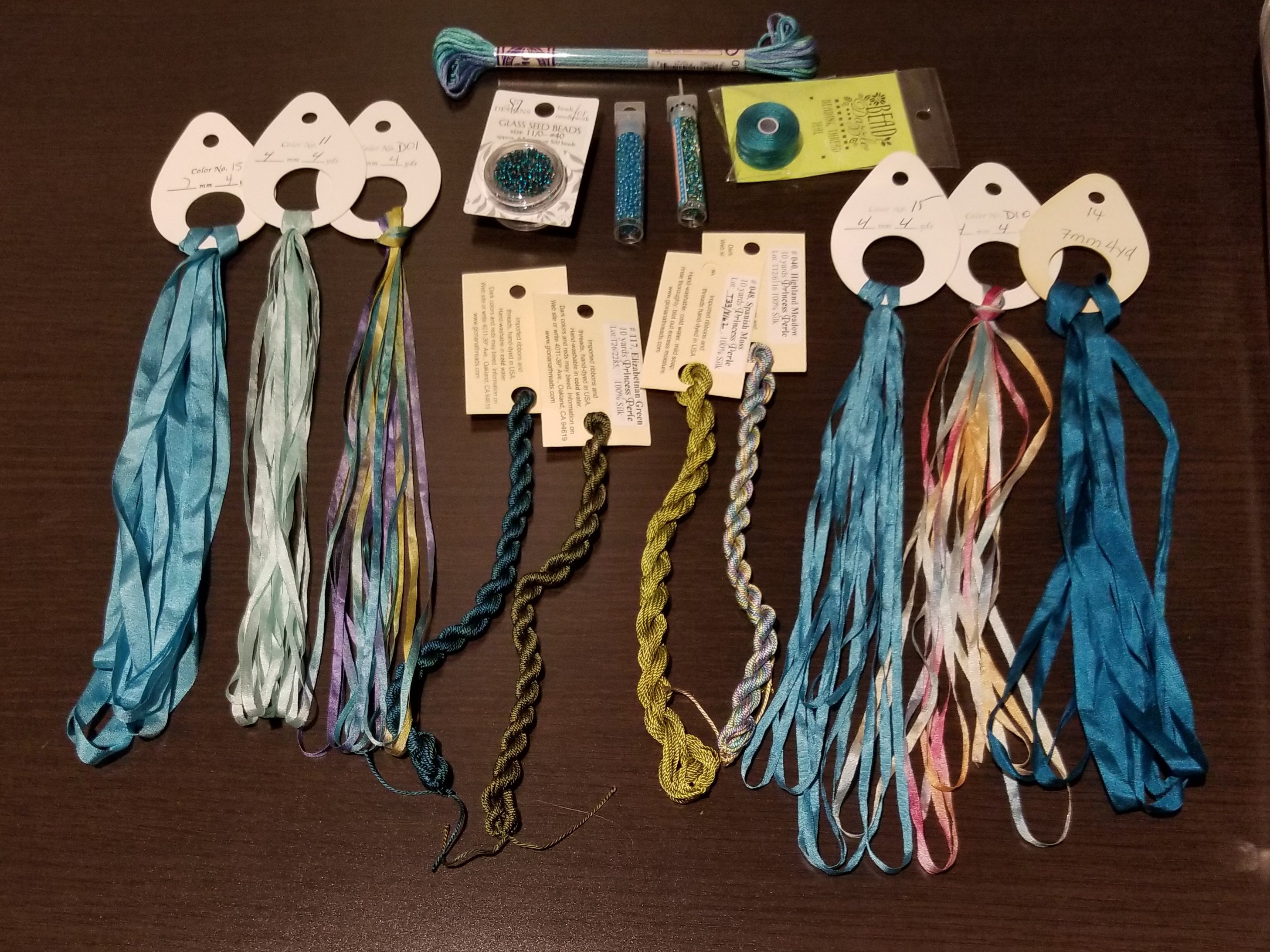 Some stitching I did on a practice canvas but most stitching was right on my stitched canvas. Many of the kit’s contents I can use but I am using some of the threads and beads that I brought with me.