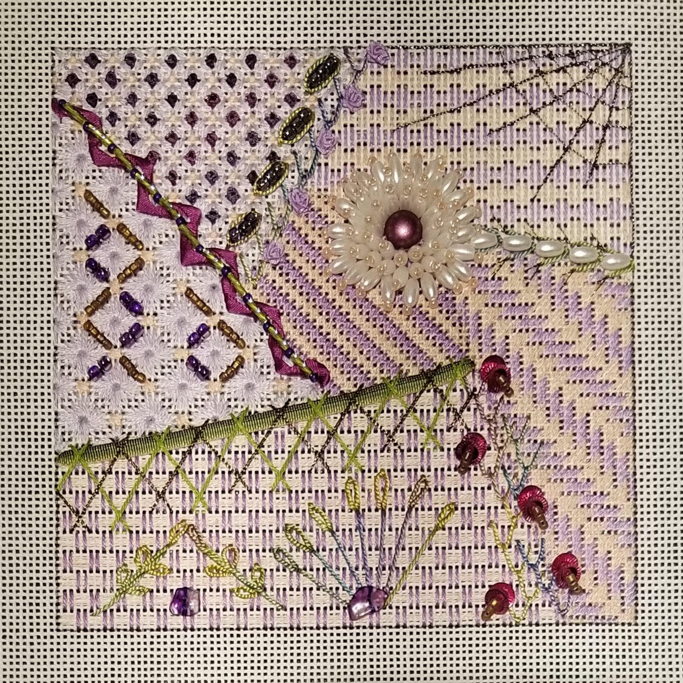 Pam had a hard time with Sisters, from the pilot class with Nancy Cucci and the good people at ANG Delaware Seashore chapter in Rehobeth, DE. In retrospect, I should have just started over on a different piece of canvas but I didn’t because I thought blocking would fix it. The left side of the canvas was warped oddly. So, despite trying 3 times to block it, the edges don’t line up with the mat on two sides. Pam said if I can’t live with it, she’d try again. But, she got it better than I expected. Now that I look at it, if the outermost silver stitched row were covered, it might be better. What would you do?