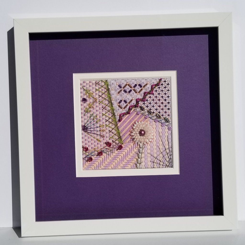 The Crazy Quilt was finished in April of 2018! It was from a class at Edwardian Needle with Betty Pillsbury. I’m very happy with the white and purple mats in a simple white frame. The piece pops. The black you see is shadow from taking the photo outside in the sun.
