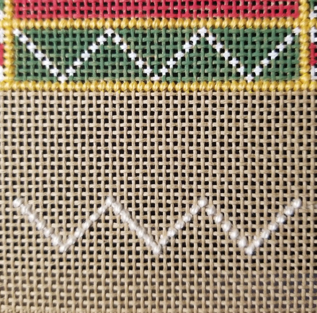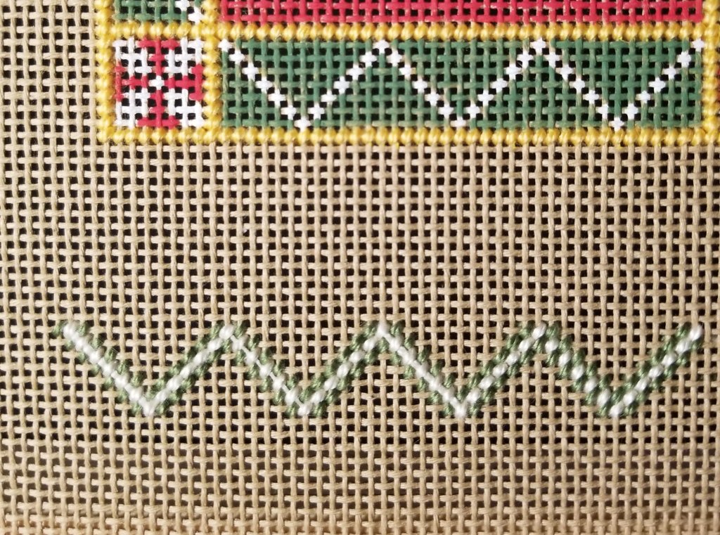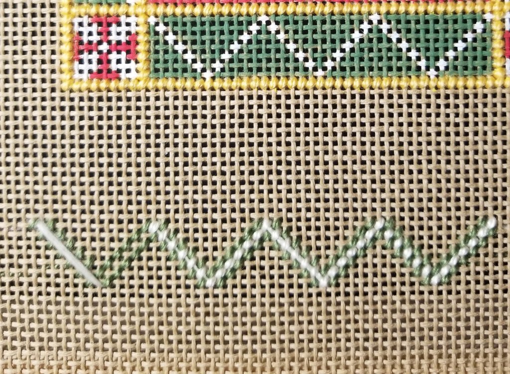 According to The Needlepoint Book by Jo Ippolito Christensen, a tent stitch is either a half cross, continental, or basketweave stitch depending on what direction you stitch it. They all look like a 1 x 1 diagonal stitch on the top of the canvas. The way I stitched the single row of the zig zag white line doesn’t appear to follow any one of these directions. So, I will just call it a tent stitch and you know I am referring to a 1 x 1 diagonal stitch going from the bottom left to the upper right.