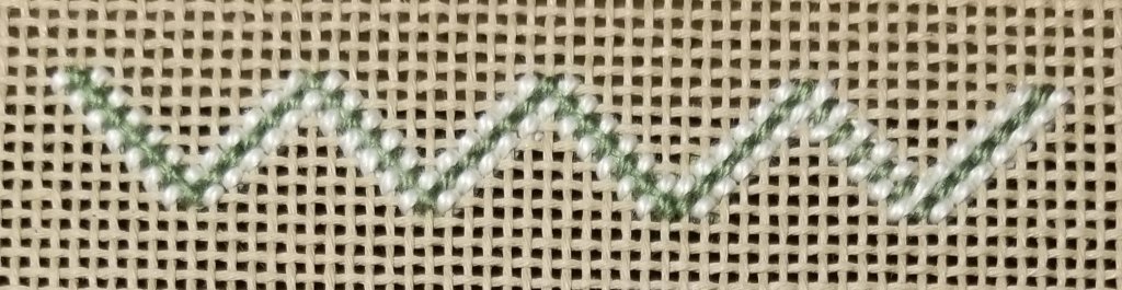 There is an issue with a single line of tent stitch when you are moving on the diagonal of a V shape. On the right side of the V, the stitches form a connecting line. However, on the left side of the V, the stitches form something like a step ladder not touching one another. On occasion, I have laid a thread from upper left end of the V to the center of the V in the same color thread to form a connecting line on both sides of the V and make it a stronger visual. It’s like couching on the diagonal. I’m sure I learned it in a class and used it before (but can’t remember where).