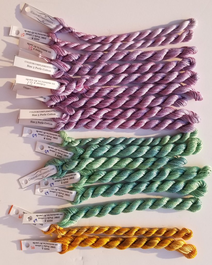 I am stitching another and last pillow for the guest bedroom. So, I have more purple threads again. This is Lavender (51) from Color Complements and DMC #5 Perle 550.