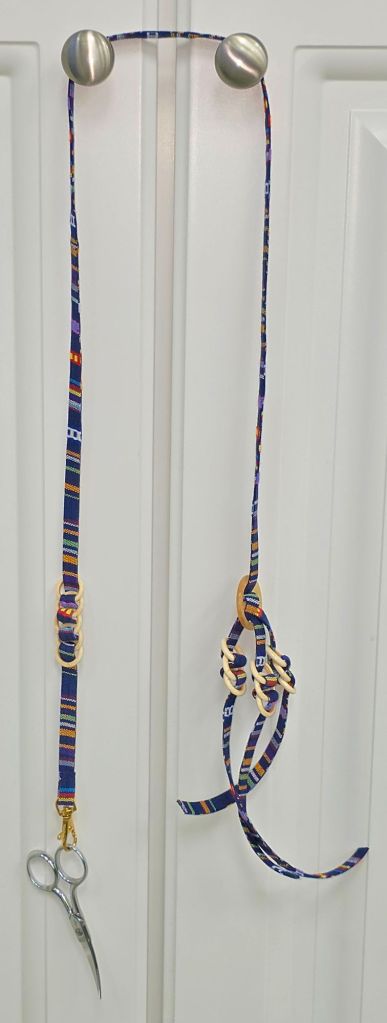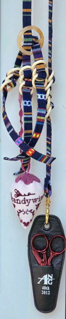 When I got home, I found scissors that have a protective leather sheath so that I won’t get stabbed when I wear it. It’s from ANG 2012 Seminar in Philadelphia celebrating the Guild’s 40th Ruby Anniversary. And, I placed the EGA Brandywine Guild strawberry on the other end. I can add 3 more tools. I haven’t decided what else to add.