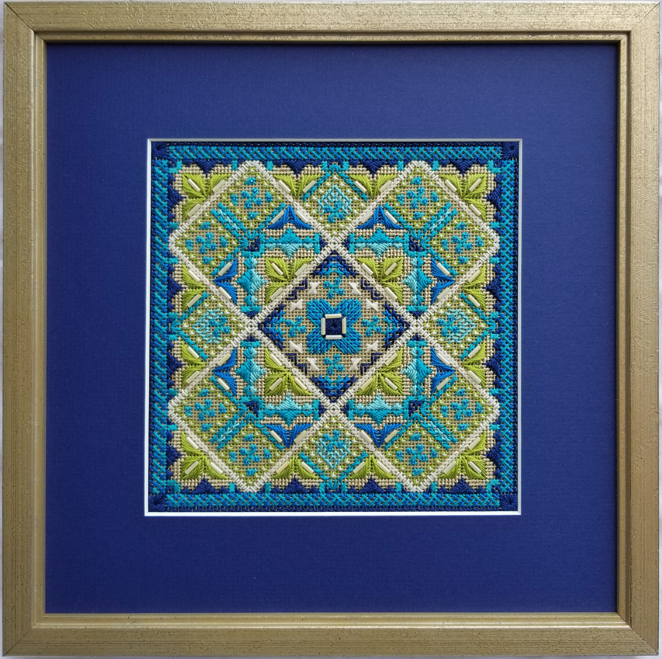 Noelle D and another person stitched Bermuda Reef by Kathy Rees. Love those blues. And, it’s a great light colored (sandy) frame and blue mat that Noelle selected.