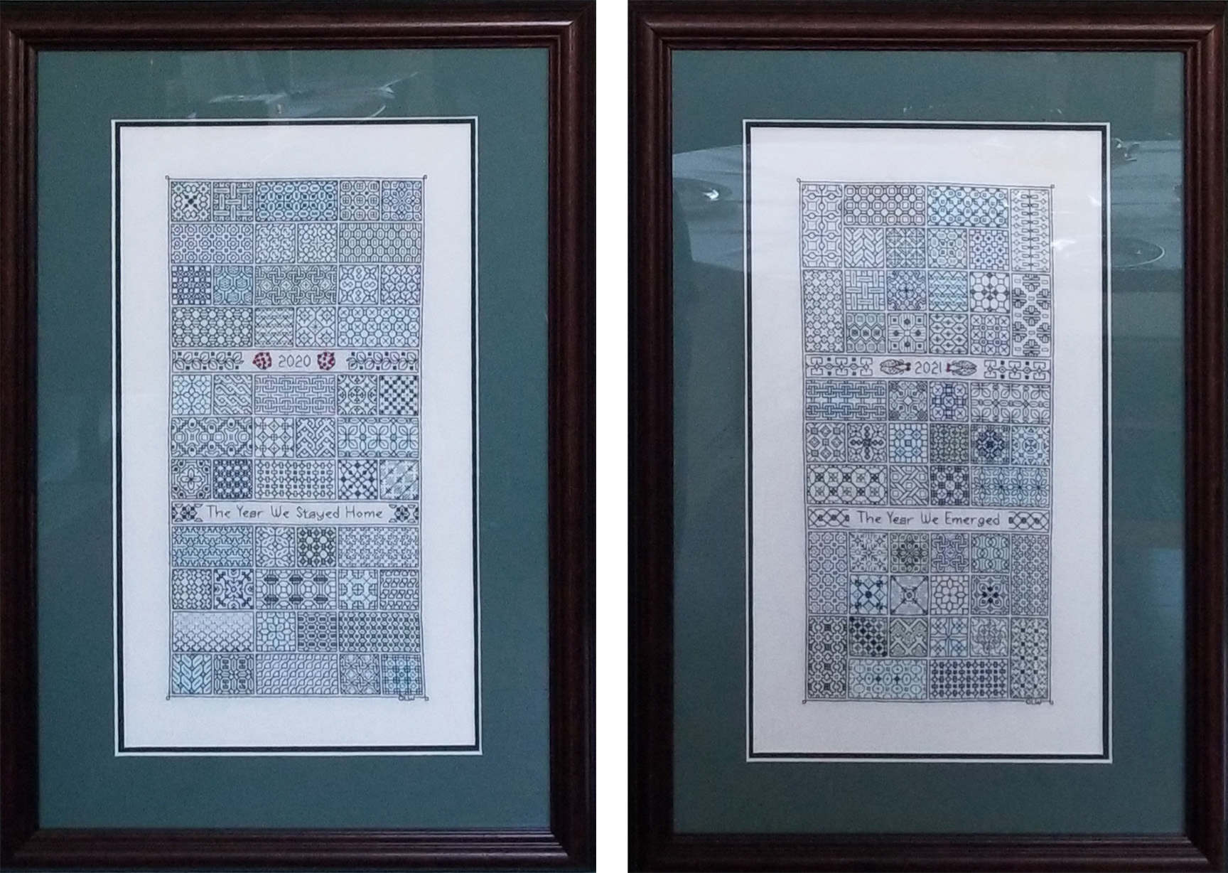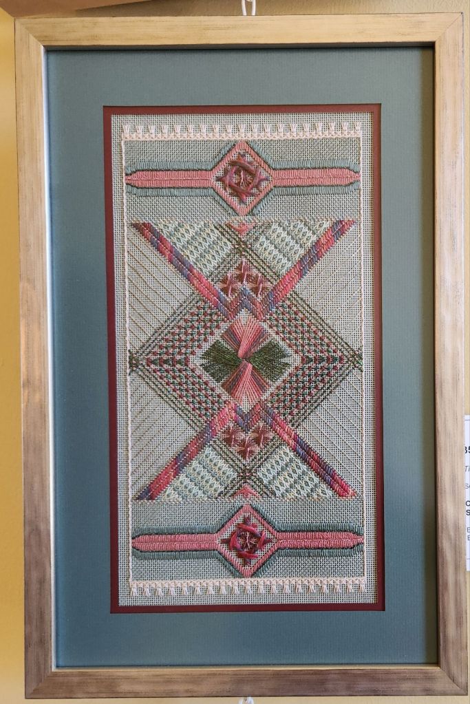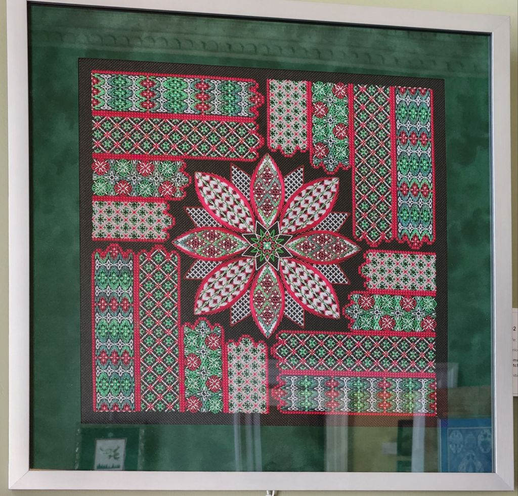 I have been hitching a ride to Woodlawn with NJNA for a couple of years now. And, since Zoom offered the opportunity to join them, I am now a member of that chapter too. I finished and framed Star of Stitches in time to accompany theirs into the 2022 Woodlawn exhibit. They have been scattered throughout the exhibit as a scavenger hunt opportunity for kids attending the exhibit.
