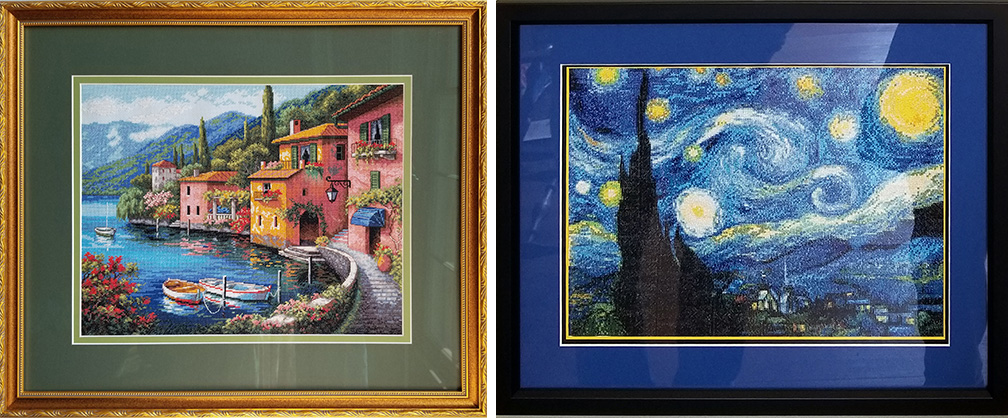 There were a good number of counted cross-stitch pieces that were stunning. In fact, Bill’s second People’s choice award went to Dimensions Lakeside Village by Elizabeth (readily found on a Google search). And, I love the Starry Night by Erin- several versions are available through a Google search but I think it might be by Artecy Cross Stitch. Both are cross stitch and such detail is achieved.