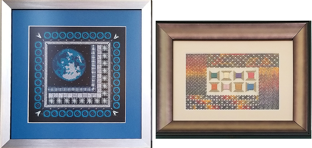 Speaking of Heather, Patti Lynn stitched her design called Once in a Blue Moon which was published in the EGA magazine, Needle Arts, in September 2020. And, Patti Lynn also stitched my design Overdyed Spools which I taught at the EGA Mid-Atlantic Regional meeting this past October using an overdyed thread of her choice. I love how Patti Lynn’s turned out. What is the chances the same woman would stitch both our designs and exhibit them in the same year! Very cool.