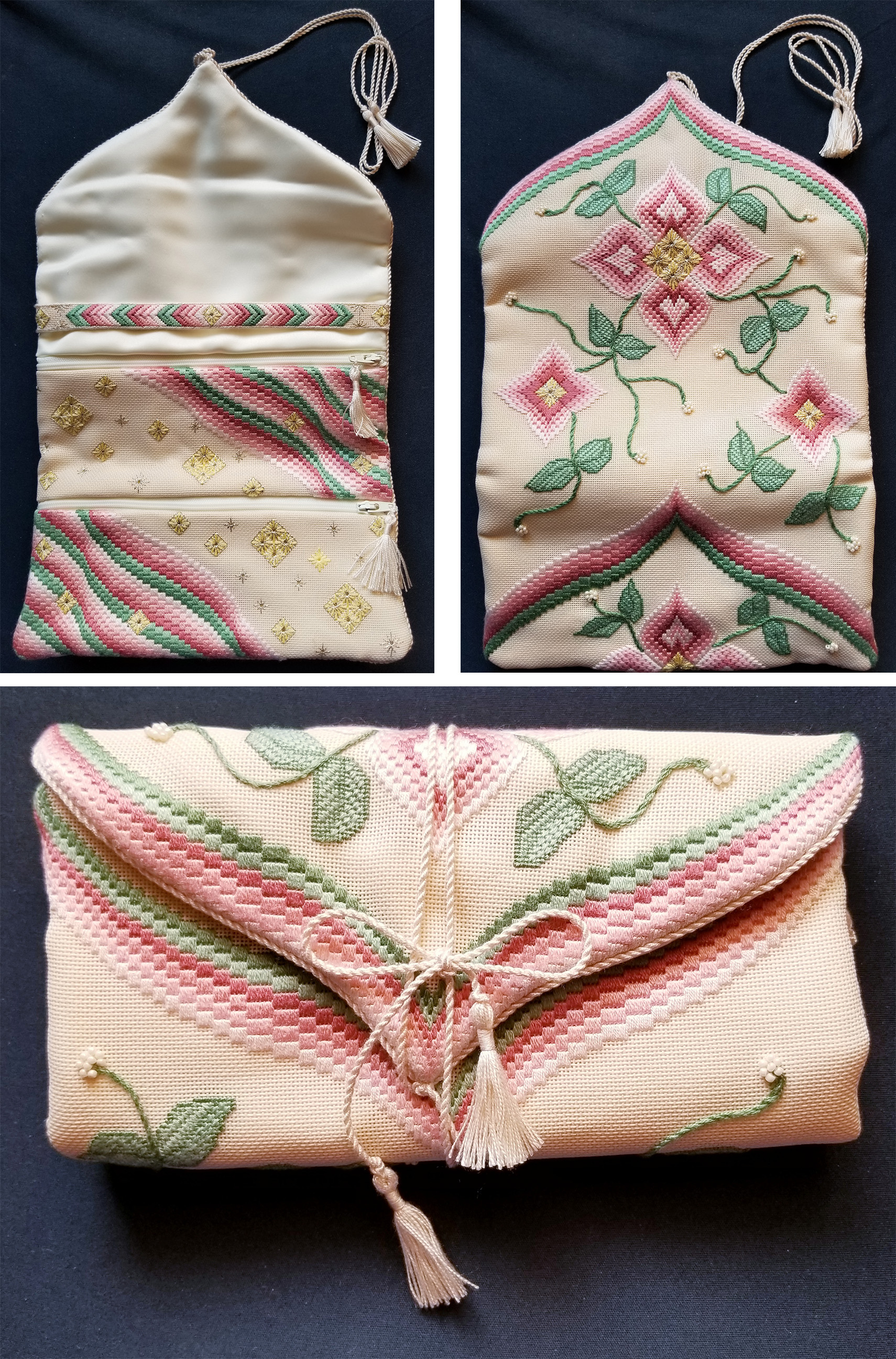 Speaking of Nelly’s Needlers, the folks who run the exhibit, always sell ginger cookies and we got some. I also picked up this bargello purse they called Nelly’s Purse. I love how the design looks open as much as when it’s closed. The finishing is impeccable. I found out the purse was designed by Pat Mazu for her journeyman level Master Teacher Program and named it Flowers on a Trailing Vine. Pat taught it 3 times, once in the Potomac/Washington DC area. No wonder I fell in love with it. Pat’s designs are amazing!