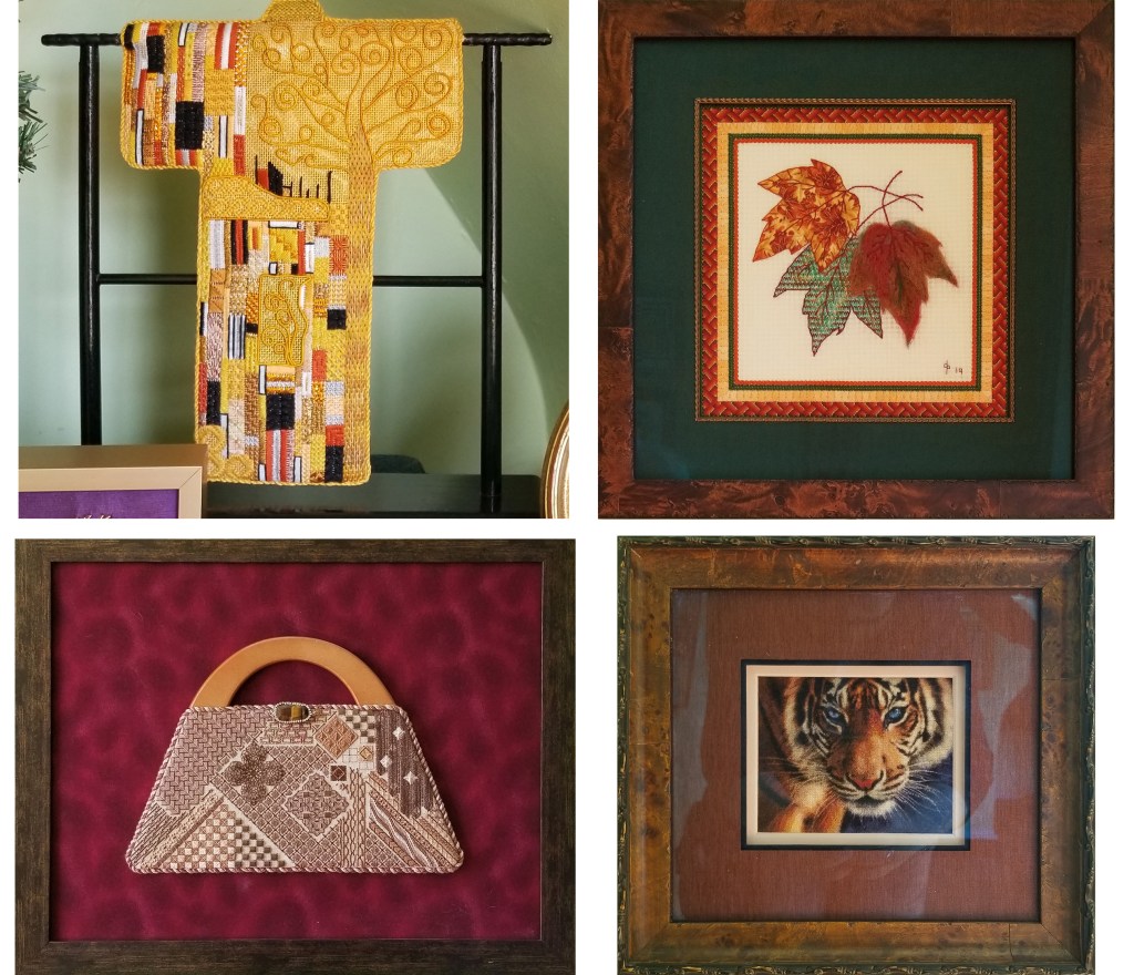Plus, there was a wonderful display of over 60 pieces by the Winchester Chapter of EGA who were celebrating their 10-year anniversary. Among pieces displayed by the Winchester Chapter were 3 of Toni Gerdes designs Klimt Kimono (a WIP for me), Autumn 3-Ways (a class I’m taking in October 2022 with the Central Jersey Chapter), and Bronze Purse (I finished stitching it but never did anything with it – I love what this person did with it). The fourth, is Donna’s 32-count miniature tiger stitched on gauze that won 1st Place and the Pope-Leighey Award in 2020 and one of our favorites! Good to see it again.