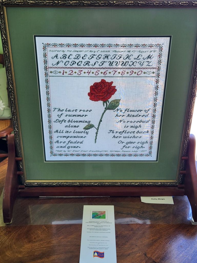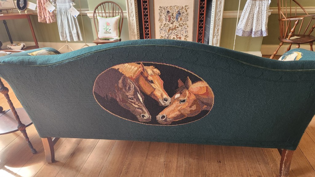To see more information on each piece exhibited, use the QR code listed in the brochure. That’s all the information in the docent paperwork located in each room. Fantastic feature! Now, if Woodlawn asked for and people included the name of the designer for commercial pieces, it would be incredible! I recognized about 3 dozen of the canvaswork counted pieces. Too many to write about but lovely to see.